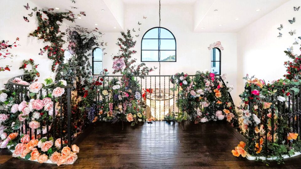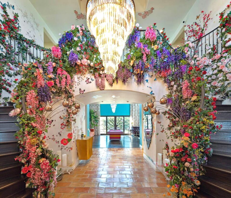 Proprietatea a aparținut actriței Bella Thorne – unul dintre copiii actori care au crescut la Hollywood – și s-a transformat într-un loc de poveste la a cărui construcție a contribuit designerul florist Kristen Alpaugh. Decorul floral se face remarcat încă de la intrare, unde o cascadă de flori îmbracă mâna curentă a scării, invitând într-o lume diferită de cea pe care o descoperim virtual în casele vedetelor de la Hollywood.