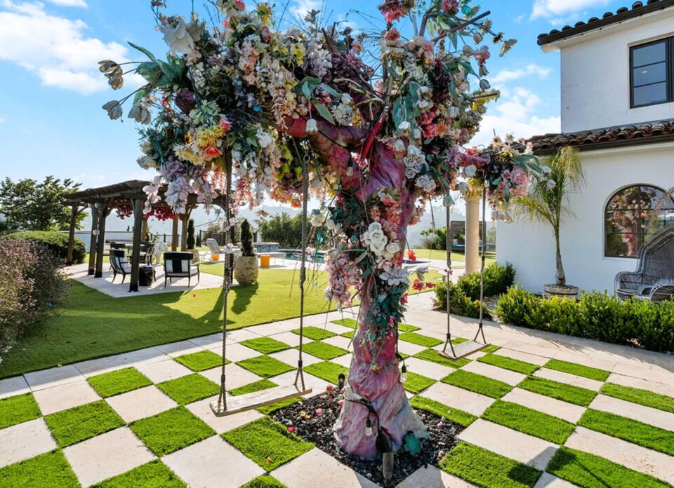 În aer liber, originalitatea continuă, cu o piscină cu pietriș lucios, un spa cu cascadă, un centru extins de grătar și un lounge cu foc de tabără, amplasate pe o peluză plată, care oferă o panoramă de 360 de grade asupra orașului, munților și Oceanului Pacific. Și, evident, oferă și un strop din Țara Minunilor, prin decorul floral extins în exteriorul casei.