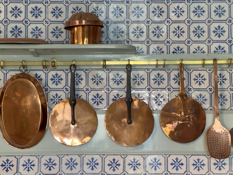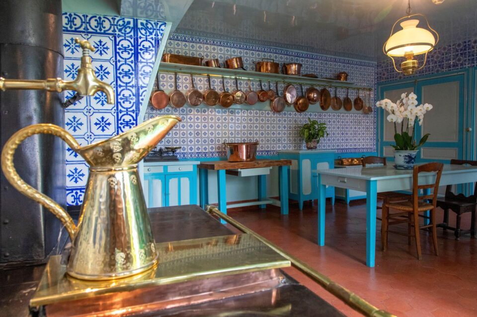 În bucătărie, răceala albastrului contrastează cu strălucirea caldă a colecției extinse de obiecte de cupru. O sobă enormă cu cărbune și lemne menținea bucătăria foarte caldă tot timpul anului. Bucătăria – cu plăcile sale albastre din Rouen, aragazul imens cu plite multiple și ustensilele de cupru – pare să aștepte încremenită întoarcerea proprietarilor.