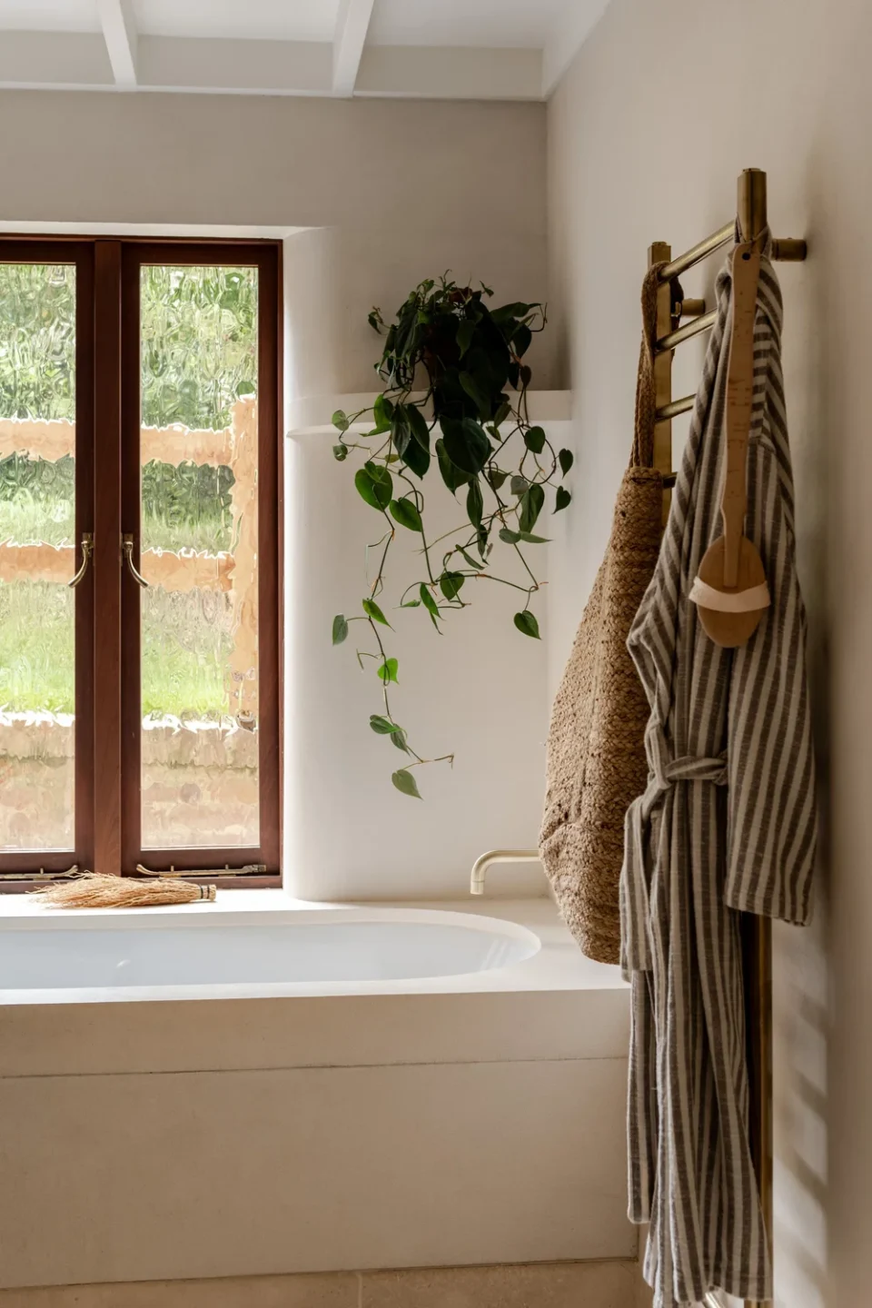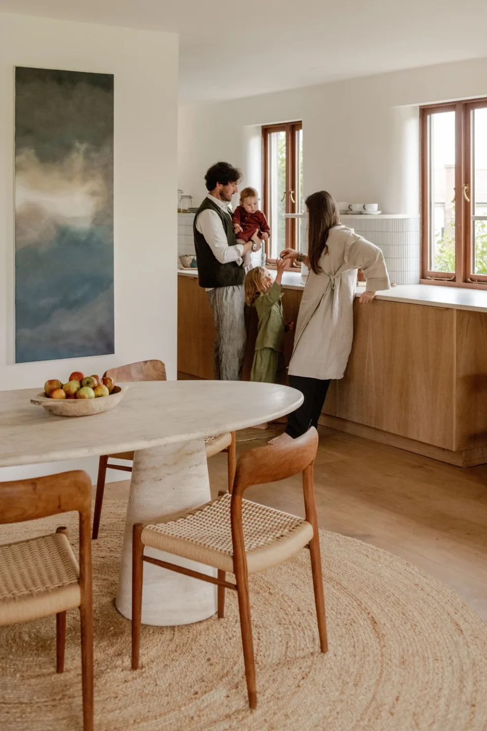 Conceput ca o completare frumoasă a zonei, un acoperiș amplu din țigle de lut se întinde peste o bază de cărămidă lucrată manual local. În interior, materialele naturale și formele fluide creează un mediu de locuit liniștit – realizat cu atenție printr-o colaborare strânsă între arhitect, client și meșterii locali.