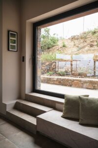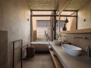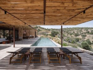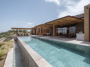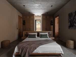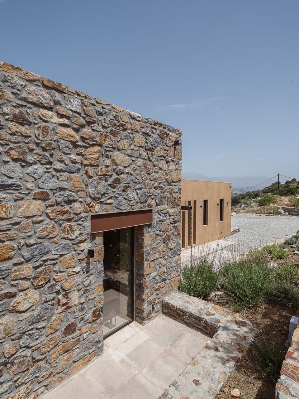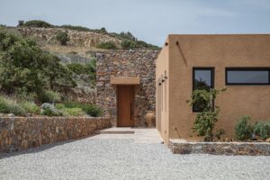 O vilă cu trei volume, conectate prin colțuri transparente din sticlă, intră în dialog cu peisajul accidentat din sudul insulei Creta, în Grecia. Este o casă de vacanță situată într-un loc în care și marea, și muntele oferă un cadru sălbatic, dar calm, specific zonelor mediteraneene. Încorporată în versantul dealului şi construită cu materiale locale, casa – un proiect premiat al Paly Architects din Atena – se deschide spre mare și munte. Se integrează natural în peisajul sălbatic, prin materiale, structură și stil. Structură în trei volume asociate zonelor de locuit Volumul central este și cel mai înalt și este realizat din piatră, celelalte două volume adiacente fiind acoperite cu o tencuială în tonuri de pământ. Primul volum conține un dormitor cu baie proprie, un birou și o toaletă comună. Volumul central include intrarea și zonele de living comune – bucătărie, sufragerie și living – într-un singur spațiu open space. Al treilea volum găzduiește dormitorul matrimonial cu baie proprie, care se deschide spre o curte interioară. Intrarea în reședință este situată în partea din spate a volumelor și, în corelare cu poziționarea lor decalatǎ, creează o curte interioară protejată de vânt. Între cele trei volume și în fața celui central, este construită o pergolă de mari dimensiuni, care se extinde până la piscină, mărind efectiv spațiul de locuit spre exterior. Panourile glisante mari din sticlă de pe laturile de nord și de sud ale volumului central creează o tranziție perfectă de la versantul natural al dealului la piscină. Pereții transparenți oferă o vedere contrinuă asupra așezării, câmpiei și mării, permițând totodată ventilația și răcirea naturală, atunci când sunt deschiși. Designul zonei exterioare este completat de o pergolă independentă în zona piscinei, o scară circulară din piatră care duce la dușul exterior, pietre mari care marchează limitele parcelei, o intrare și o zonă de parcare pavate cu pietriș. Întregul proiect se bazează pe materiale naturale din regiune, care construiesc aerul natural și integrează locuința în peisaj. Piatra este dintr-o sursă locală, la fel pietrișul de la intrare și din zonele de parcare, tencuiala exterioară este cu paie și tonuri de pământ, iar metalele au culoarea ruginii. În interior mai ales, au fost folosite lemn de castan și multe tonuri de bej. Gresia cotto îmbracă podelele atât la interior, cât și la exterior, într-un stil care parcă vine de la sine. Ramele de la ferestre sunt din aluminiu negru – un accent mai întunecat într-o zonă atât de luminoasă – combinate cu lemn de iroko. Compoziția pe ansamblu – minimalistă și geometrică – contrastează tăcut cu stâna din vecinătate, relaționând subtil cu aceasta prin onestitatea formelor sale. În mijlocul sălbăticiei, această casă de vacanță aduce o arhitectură care nu se impune peisajului, ci se integrează, respiră și îi aparține, simplă și naturală ca împrejurimile. Foto: George Anastasakis CITEȘTE ȘI: Amenajare contemporană cu ecouri grecești, în acest studio din Syros Arhitectura culorii: 7 orașe curcubeu care trebuie explorate cu ochii larg deschiși Călătorie cu plecare din social media: peșterile din Oia și hotelurile lor instagramabile (galerie foto) Distribuie articolul pe: