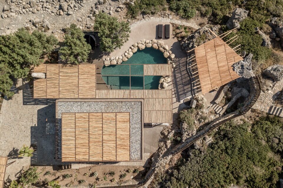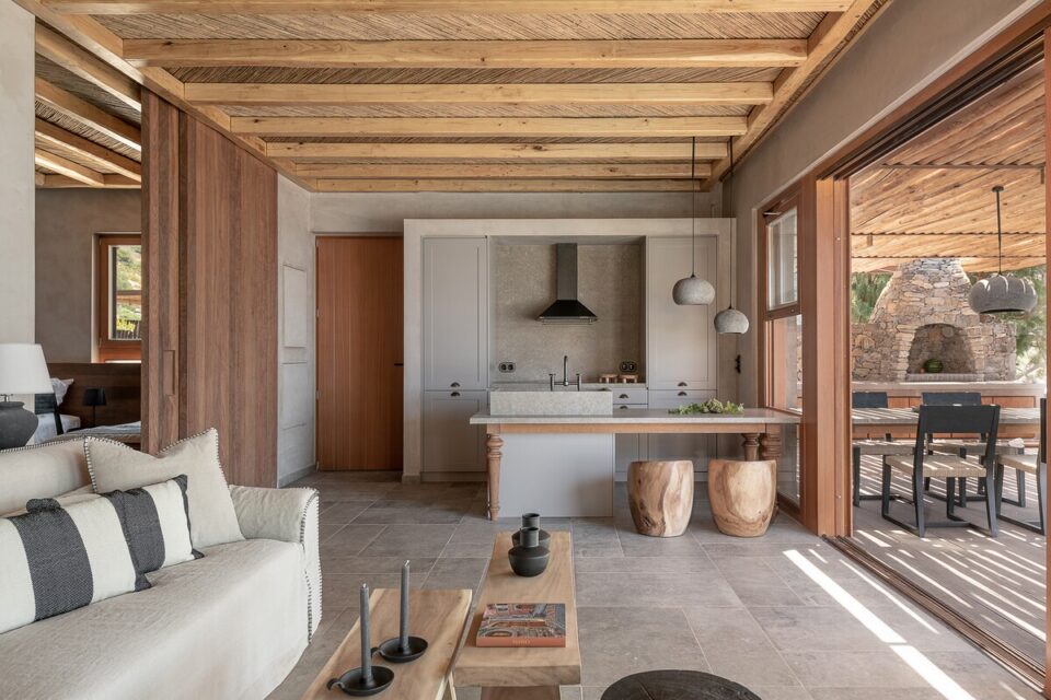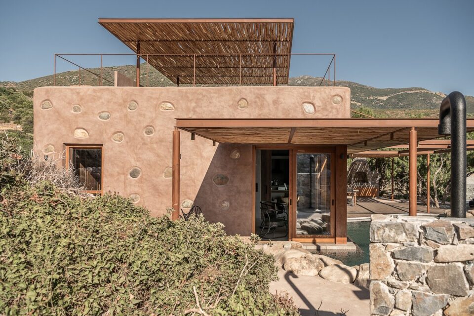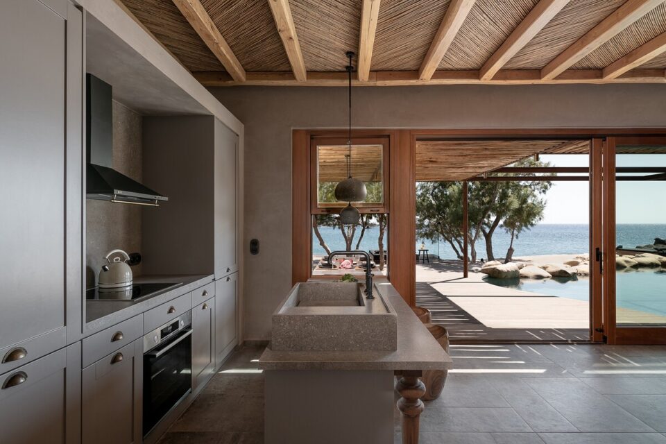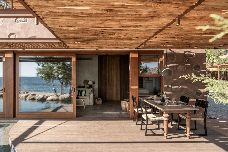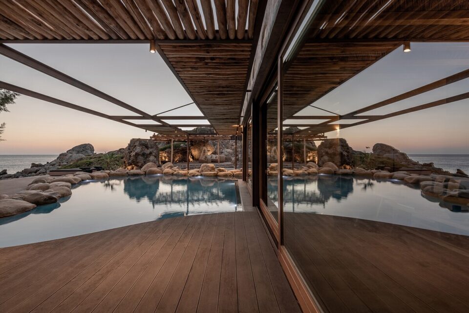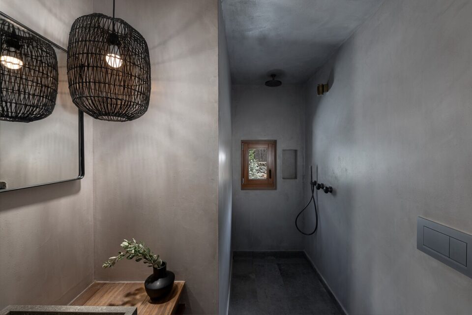 Pe coasta sălbatică din Chania, într-o zonă liniștită din Livadia (Grecia), se află o casă de vacanță integrată atât de bine în peisaj, încât piscina sa pare o extensie a mării – sau invers – și continuă peisajul natural mediteranean într-o zonă construită de mâna omului. Proiectul, cunoscut sub numele de „Native Beach Villa”, este realizat de biroul Paly Architects, sub coordonarea arhitecților Nikos Lykoudis și Ismini Papaspiliopoulou. O arhitectură simplă, inspirată de peisaj Casa este definită de o formă geometrică clară: un volum dreptunghiular, un „cub” în care jocul dintre plin și gol creează dinamism vizual. Această simplitate este specifică arhitecturii grecești contemporane, unde accentul cade pe proporții, lumină și relația cu mediul. Amplasarea este esențială pentru concept: terenul este delimitat natural de trei arbori de tamarisc, care oferă umbră și un sentiment de protecție. Spre sud se deschide priveliștea către mare, cu nuanțele intense de albastru, iar spre nord se ridică relieful stâncos al muntelui. Aceste contraste naturale definesc spațiul și dau identitate locuinței. Piscina care extinde marea Un element spectaculos este piscina cu formă liberă, modelată după rocile din zonă. Aceasta devine o extensie vizuală a mării, ca și cum valurile ar pătrunde într-un mic golf natural. Este un exemplu clar de design care nu impune, ci continuă peisajul. Terasa exterioară, organizată într-o formă dreptunghiulară simplă, funcționează ca un living în aer liber, preluând atât de populara tendință de a dizolva limitele între interior și exterior, încurajată și de clima perfectă a zonei. Terasa se prelungește până la o platformă suspendată deasupra mării, oferind o experiență directă și autentică a mediului natural. Bucătăria exterioară, construită din piatră și prevăzută cu un cuptor tradițional, închide și definește spațiul de zi din exterior. În același timp, ea adaugă un element autentic, inspirat din stilul de viață mediteranean, unde clima este blândă, iar viața din interior migrează ușor afară și invers. Influența locală în abordări, materiale și texturi naturale Un aspect esențial al proiectului este alegerea materialelor, toate provenind din zonă. Piatra, lemnul și metalul sunt folosite într-un mod echilibrat, păstrând o paletă cromatică naturală. Exteriorul este finisat în tonuri de pământ și ajută casa să se integreze discret în peisaj, care se infiltrează apoi nestingherit înăuntru. Ferestrele largi cu rame din lemn, culorile naturale, brute chiar generează căldură sub soarele mediteranean și prin asociere cu lemnul periat de iroko. Contrastul este subtil, între nuanțe cu aceeași proveniență, accentuate ușor prin metalul negru al accesoriilor de baie sau al coprurilor de iluminat. La exterior, terasa are pardoseală din mortar lustruit tradițional, combinat cu piatră locală cioplită, ceea ce întărește caracterul autentic al construcției. Pietrele într-o dezordine naturală, acoperișurile naturale și vegetația care se extinde de la sine în jur îmbracă locul în calm, exact ce trebuie pentru o vacanță liniștită în mijlocul sălbăticiei. Foto: George Anastasakis CITEȘTE ȘI: Casă de vacanță în țara lui Moș Crăciun: minimalism în stil scandinav Tradiționalul reinventat într-o casă veche, loc de vacanță perpetuă în Tinos Minimalism în negru și materiale naturale într-o casă de vacanță, în context rural Distribuie articolul pe: