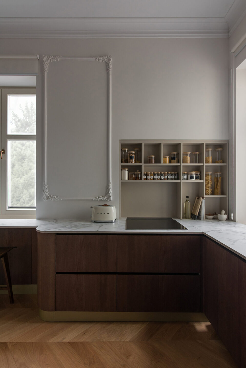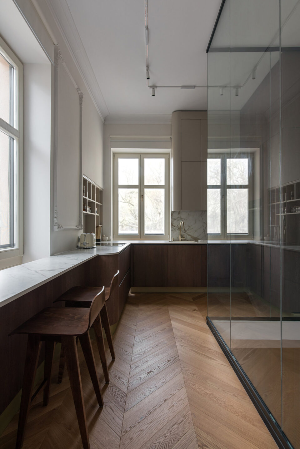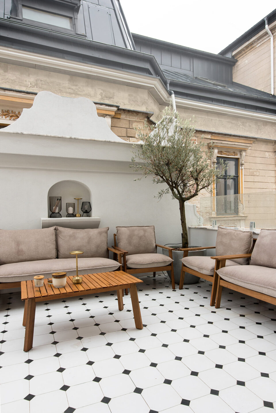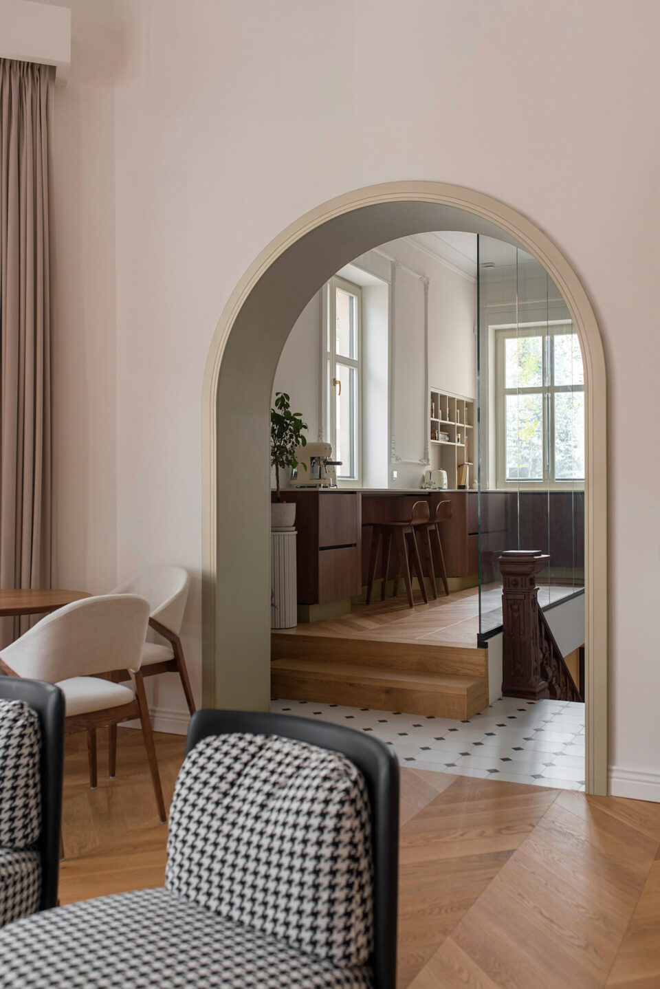 Un apartament dintr-o casǎ neoclasicǎ din 1927, din centrul Bucureștiului, cu plafoane înalte, tâmplărie din lemn originală și o scară monumentală este azi locuința modernǎ şi funcționalǎ a unei familii contemporane. Casa păstreazǎ eleganța vremurilor de demult, după ce a traversat un proces de restaurare și amenajare de lux interioară. Proiectul a plecat de la ideea de coexistență între arhitectura istorică și limbajul contemporan, dar într-o formă care să le pună pe ambele în valoare, nu în contrast. Proiectul își propune să ofere un răspuns la tema „Bucureștiul estetic” nu prin gesturi formale spectaculoase, ci prin reactivarea subtilă a valorii arhitecturale existente. În acest apartament locuiesc doi tineri recent cǎsǎtoriți, cu un stil de viață activ și sociabil. Dialogul strâns între echipa de arhitectură și beneficiari a permis formularea clară a priorităților: funcționalitate, păstrarea caracterului istoric, dar și definirea unei estetici coerente, adaptate sensibilității contemporane. Forma și finisajul se potențează reciproc Pe acest fond, plafoanele decorative, proporțiile ample ale camerelor și scara interioară au fost păstrate ca repere centrale. Volumele mobilierului, cromatica și texturile propuse definesc o estetică coerentă, articulată în jurul elementelor istorice existente. Finisajele urmează coerența și logica materială a locuinței originale. Pardoselile sunt preponderent din parchet triplu stratificat în zonele de dormit și de zi, păstrând tipologia specifică amenajărilor interbelice. În zona de acces, la bucătărie și la baie designerii au folosit placări ceramice cu motive decorative, ca referință directă la limbajul ornamental al începutului de secol XX. Tâmplăria din lemn a fost conservată, restaurată și consolidată, la fel ca profilele și stucaturile existente. Paleta cromatică este compusă din tonuri calde și saturate – portocaliu, teracotă, verde salvie – reminiscențe reinterpretate ale interioarelor de sfârșit de secol XIX, în contrast cu pereții neutri și suprafețele mate. Mobilierul lasă structurii loc central Mobilierul fix este realizat din MDF vopsit și furniruit, executat local, cu rol dublu – funcțional și volumetric. Piesele sunt desenate pentru a optimiza spațiul și a lăsa frumusețea structurală a încăperilor să iasă în evidență. Zona de zi este centrată pe o canapea generoasă, completată de fotolii cu structură metalică și o masă din lemn masiv, produsă local. Marmura, imprimeul alb-negru al fotoliilor și catifeaua completează aerul pretențios al ambientului, completând eleganța interbelică a clădirii. În asemenea logică, intervențiile actuale – precum iluminatul cu leduri ori separatoarele din sticlă – trec neobservate. Mobilierul din bucătărie păstrează o linie formală unitară, cu fronturi netede, detalii discrete din metal și finisaje mate. Lemnul cu fibră închisă completează eleganța, nu o abrutizează. Schema cromatică și finisajele continuă în baie, cu alăturarea lemnului nobil și a suprafețelor satinate ale bateriilor aurii, cu marmura cu inserții roșcate colorând natural pereții dușului. O compoziție aparte este rezervată zonei matrimoniale, unde, pe fundalul peretelui curbat, designul devine sculptural, prin plasarea căzii de baie freestanding pe un postament din marmură. Iluminatul și accesorizarea subliniază eleganța naturală a spațiului, înălțimea conferind locului prestanța unei opere artistice. Limbajul eleganței scrie povești și în exterior Într-o notă poetică, terasa leagă interiorul casei de zona urbană, arhitectura jucând în folosul designului. Amenajarea terasei a urmărit restabilirea relației inițiale cu arhitectura clădirii, fiind păstrate frontonul tencuit și decorat în stil neoclasic, precum și parapeții originali. Pardoseala este acoperită cu plăci ceramice cu model caroiaj alb-negru, tipic perioadei interbelice. Mobilierul este minim și discret, completat de vegetație integrată punctual. Un măslin amplasat într-un colț al terasei întărește atmosfera domestică, fără să perturbe caracterul arhitectural al fațadei. Terasa rămâne un spațiu versatil, folosit constant, atât pentru repaus, cât și pentru viața socialǎ. Valoarea acestui proiect derivă din calibrarea atentă a locuirii – prin conservarea, restaurarea și reinterpretarea elementelor existente ale casei: scara monumentală din lemn masiv, tâmplăria originală, obiectele decorative, stucatura, dar și anumite piese de mobilier. Proiectul devine astfel un exercițiu de estetică aplicată și o propunere de bună practică pentru regenerarea locuirii urbane în Bucureștiul contemporan. Acest proiect, realizat de Laboratorul de Arhitectură – arh. Cristina Stroe, arh. Alina Dumitrescu, arh. Ioana Ciobanu – a fost înscris la Anuala de arhitecturǎ Bucureşti, ediția 2025, fiind nominalizat la secțiunea Amenajǎri interioare/ Amenajǎri rezidențiale. Foto: Kateryna Zolotukhina Distribuie articolul pe: