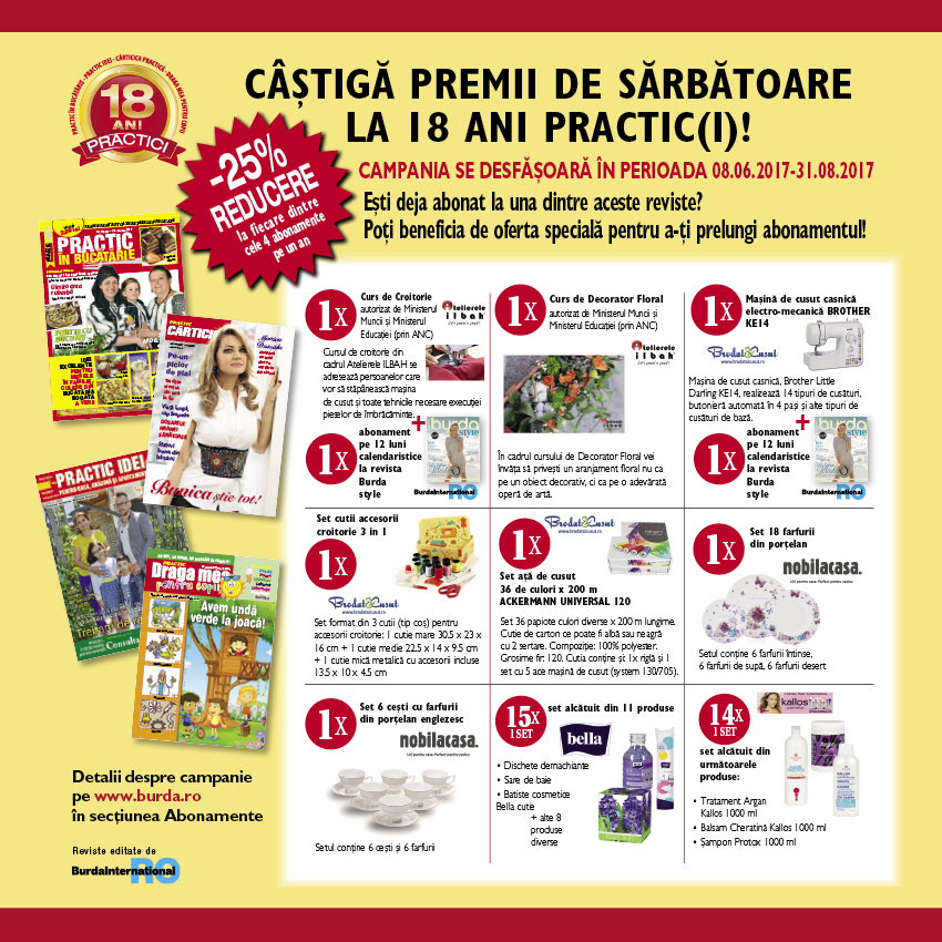 Abonează-te acum la una sau la mai multe dintre revistele tale preferate: PRACTIC ÎN BUCĂTĂRIE, PRACTIC IDEI PENTRU CASĂ, GRĂDINĂ ȘI APARTAMENT, PRACTIC CĂRTICICA PRACTICĂ, PRACTIC DRAGA MEA PENTRU COPII și poți câștiga o mulțime de premii! EȘTI DEJA ABONAT LA UNA DINTRE ACESTE REVISTE? POȚI BENEFICIA DE OFERTA SPECIALĂ PENTRU A-ȚI PRELUNGI ABONAMENTUL! Detalii despre campanie și abonamente aici: https://www.burda.ro/categorie-produs/toate-produsele/ Campania este valabilă până pe 31 august 2017. Distribuie articolul pe: