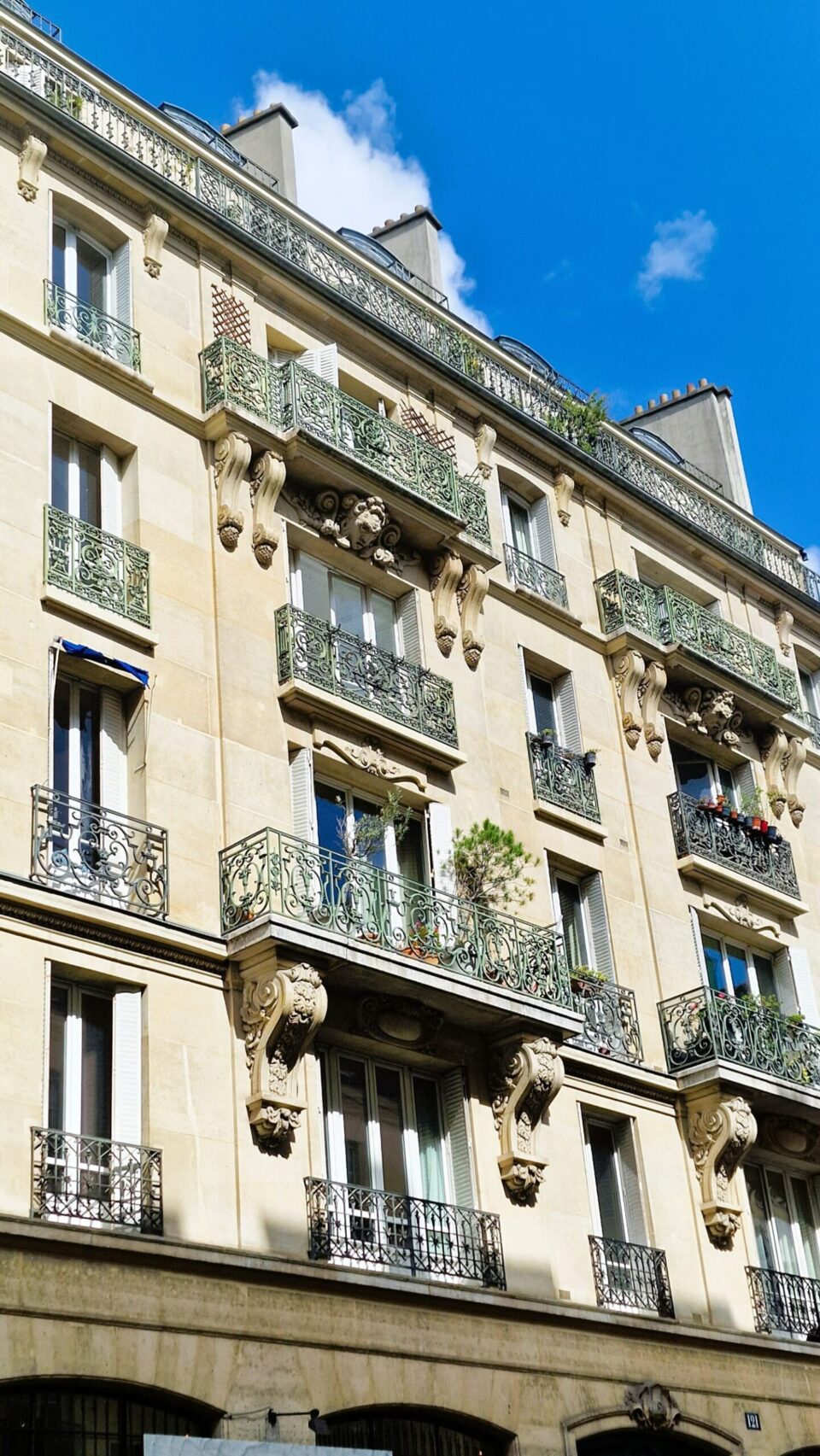 Alături de ferestre și acoperișuri, balconele clădirilor din Paris au propria frumusețe, dublată de multitudinea de plante pe care francezii le au chiar și atunci când locuiesc în case mici. De regulă, balcoanele au balustrate din fier forjat migălos lucrate, cu motive florale și decorative care se corelează frumos cu arhitectura clădirilor din care fac parte.