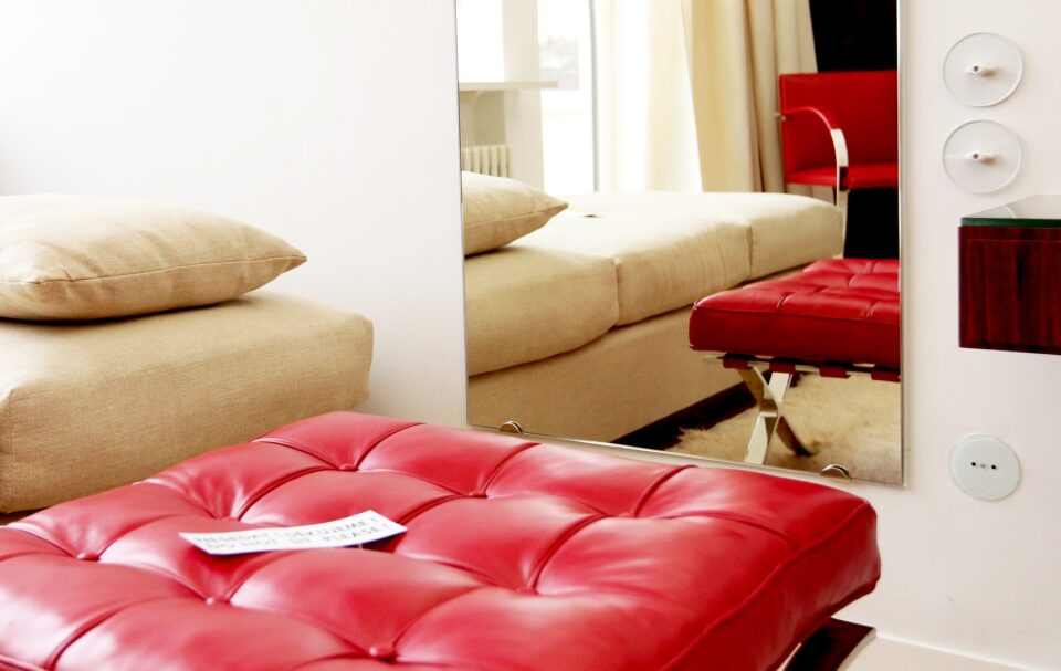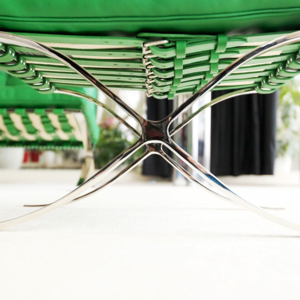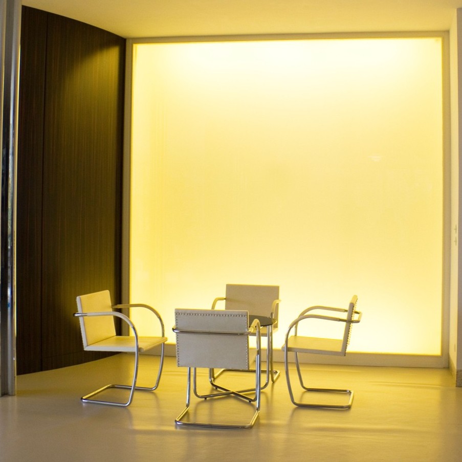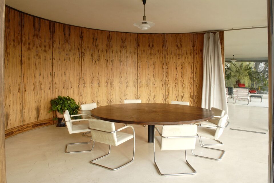 Alături de acestea, Ludwig Mies van der Rohe aduce oțelul cromat, material reprezentativ pentru designerul german atât în design, cât și în arhitectură, instalând în acest spațiu piese iconice. Găsim fotoliile Barcelona în diferie culori (roșu, verde, cafeniu), unul din cele mai cunoscute obiecte de design și reprezentative pentru mișcarea modernistă. Și, mai ales, scaunele Brno, create de der Rohe special pentru această locație.