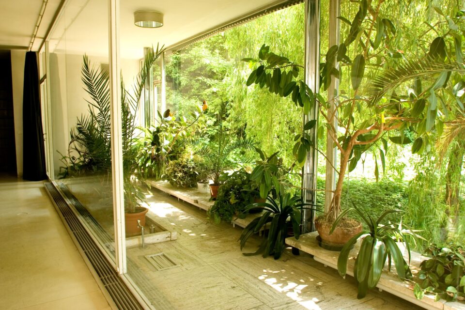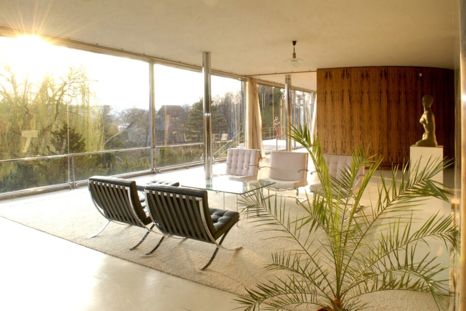 La fel de importantă este relația dintre interior și exterior. Ferestrele mari din sticlă permit luminii naturale să pătrundă din plin și oferă priveliști largi asupra grădinii și orașului. Unele panouri de sticlă puteau fi coborâte complet, transformând livingul într-un spațiu aproape deschis către exterior, o inovație tehnică impresionantă pentru acea vreme.