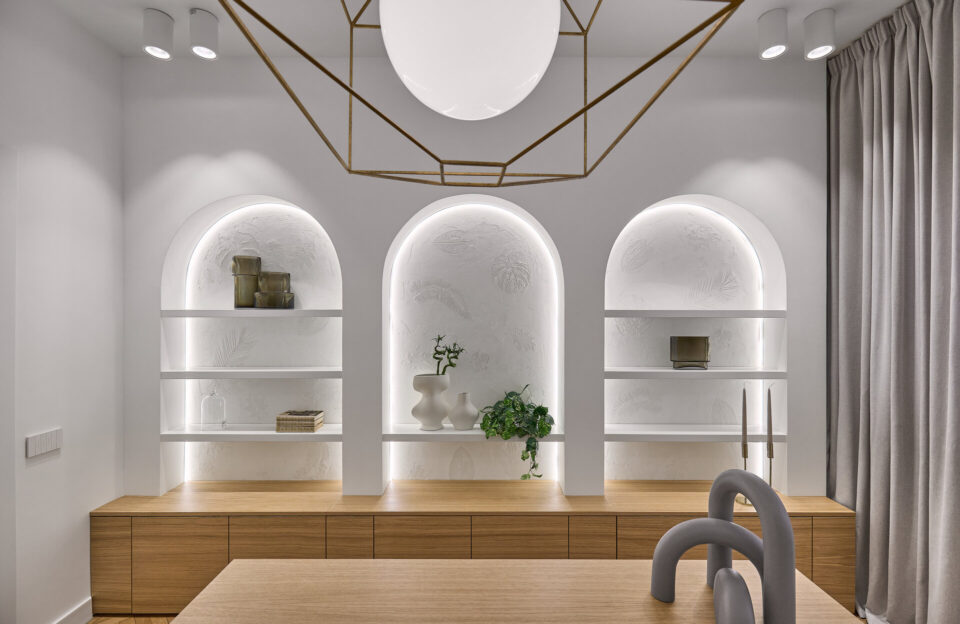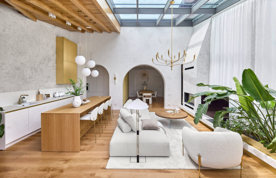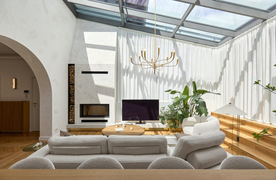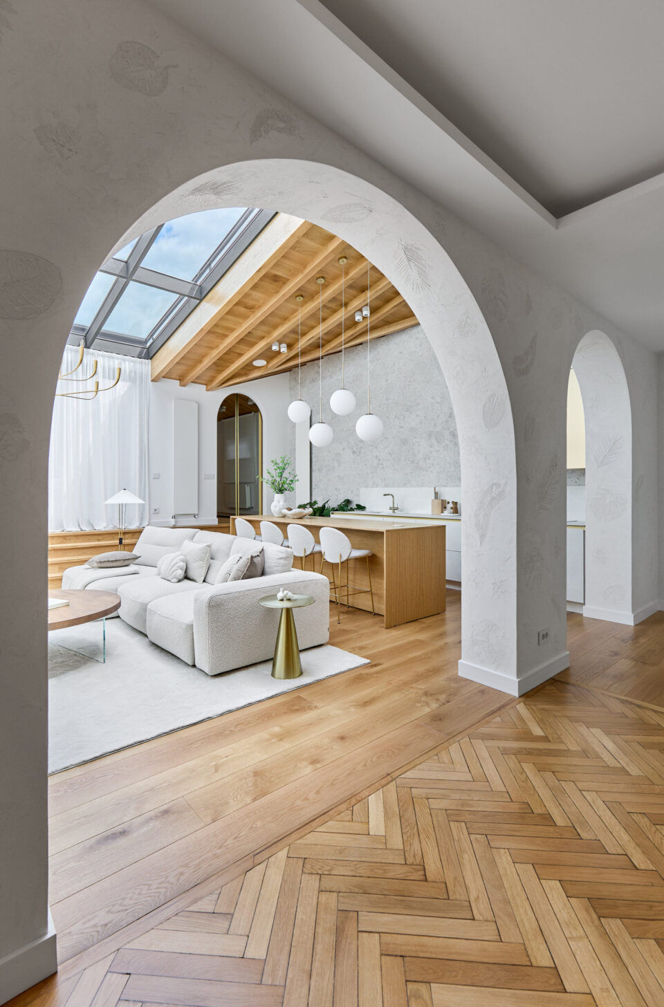 Un apartament întins pe un întreg etaj, dintr-o vilǎ de lux interbelicǎ din Bucureşti, scrie o poveste de dragoste între soare și natură prin limbajul designului. Este învǎluit în luminǎ naturalǎ, are plafonul livingului din sticlǎ, iar lemnul din mobilier, pardosealǎ şi tavan este pus în valoare de toatǎ puterea soarelui. Ideea amenajării acestui apartament de către arhitecții de la Dofinteriors a fost de a crea o oază de liniște, seninătate și echilibru, într-o reședință plasată în agitația cotidiană a orașului. Locuința se întinde spectaculos pe întreg etajul într-o vilă de lux interbelică, unde contemporanul și-a făcut totuși loc. Livingul cu alură de amfiteatru are o amplă și surprinzătoare deschidere spre cer, ceea ce i-a determinat pe arhitecți şi designeri să facǎ din natură, cu multiplele ei fațete, o prezență continuă și în interior. Proprietarii au dorit ca amenajarea sǎ aibǎ accente subtile ale stilului japandi – o formă de minimalism prietenos, în care fuzionează simplitatea funcțională a designului scandinav contemporan cu „imperfecțiunea” organică, sofisticată și misterioasă a esteticii japoneze, dar fǎrǎ a renunța la eleganța pe vila o impunea. Personalitate în linii curbe într-un spațiu fluid Personalitatea spațială este definită de elemente precum arcadele, plafonul vitrat, lemnul, plantele și lumina naturală din abundență. Nuanțele subtil-vibrante de auriu dau interiorului o notă suplimentară de căldură, fiind accentul stilistic care confirmă eleganța. Peretele cu cele două arcade – structuri arhitecturale distinctive – aflat între casa veche și intervenția nouă capătă dublu sens, în acest proiect. Pe de-o parte, servește ca punte între trecut și prezent, legând un element cu influență istorică de spațiul cu intervenție contemporană. Apoi, concret, leagă zona de zi deschisă către terasa generoasă și zona de noapte, construind astfel un spațiu de o fluiditate funcțională. Întrepătrunderea dintre interior și exterior este constant subliniată de suprafețele vitrate, de prezența bogată a plantelor și, în mod sugestiv, de motivele vegetale care învăluie pereții. S-a recurs atât la tapet, cât și amprentările manuale ale vopselei decorative, devenite o semnătură care indică atenția pentru valențele tactile ale materialelor. Poveste de dragoste între lemn și lumină Alți actori însemnați pe scena acestei amenajări sunt, fără îndoială, lumina și lemnul, care se completează și se pun în evidență reciproc, fiecare cu jocul său de nuanțe și reflexii. Zonele inundate de lumină naturală sunt configurate strategic pentru ca fiecare detaliu al interiorului să capete o strălucire armonioasă. Împreună, construiesc un cadru diafan și aproape atemporal, un spațiu al relaxării și contemplării, în care timpul pare să-și încetinească ritmul. Lemnul natural, masiv și grațios totodată, în texturi și nuanțe blânde, se regăsește nu doar la nivelul mobilierului și pardoselii, ci și în placări parietale și parțial ale plafonului, ca o „coajă” învelind protector interiorul și asigurând continuitatea discursului vizual-tactil. Proiectul a fost înscris la Anuala de Arhitecturǎ, ediția 2024, la secțiunea Amenajǎri interioare/ Amenajǎri rezidențiale sunt arhitecții Raluca Dofin, Radu Dofin şi Razvan Malancioiu. foto: Arthur Tintu CITEȘTE ȘI: Un apartament unde culoarea, stilul și dualitatea dictează scenografia amenajării O vilă maură din Bucureștiul interbelic renaște păstrându-și coerența în stil Patru ani de încercări și 5% albastru definesc amenajarea acestui apartament Distribuie articolul pe: