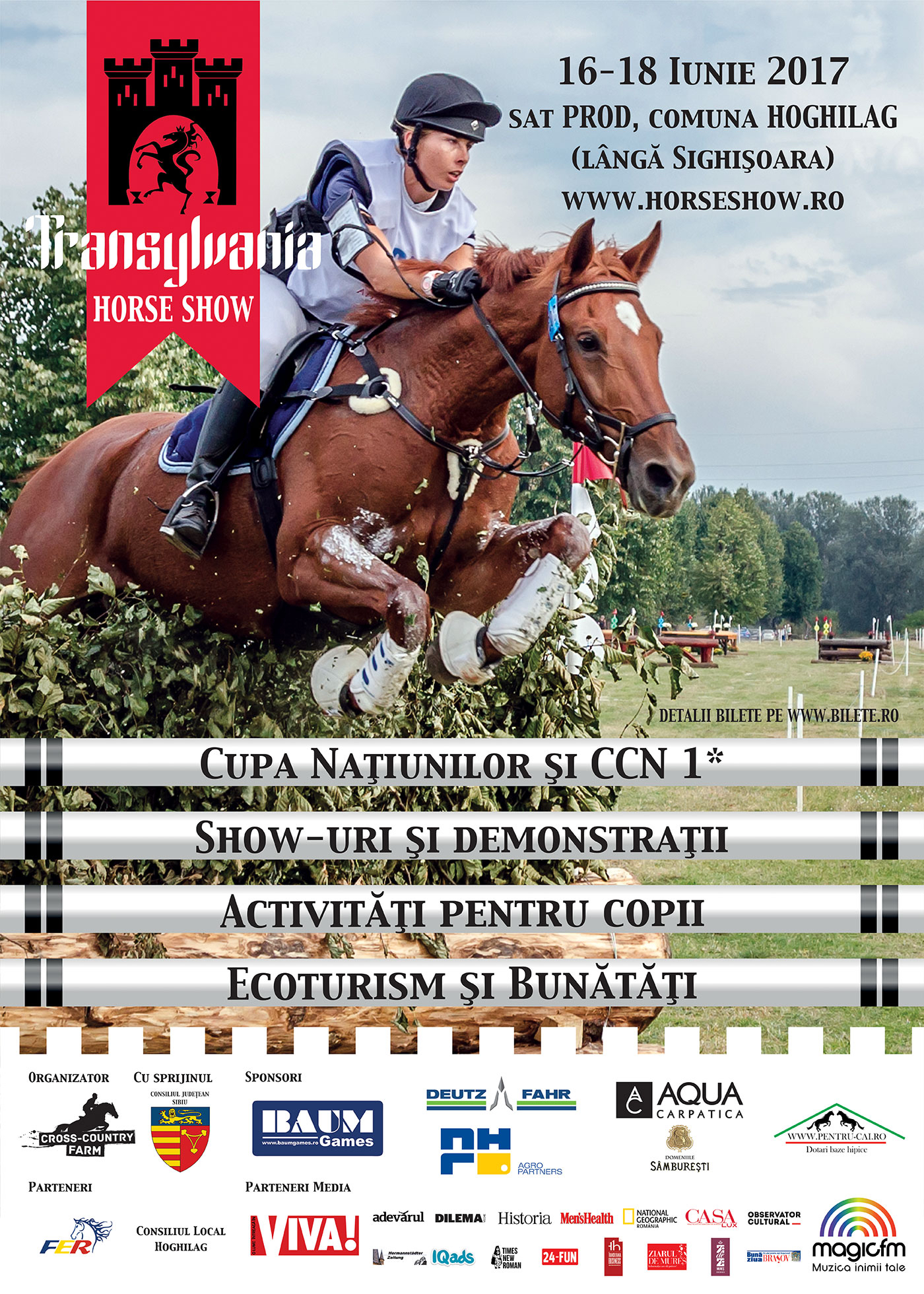 16-18 iunie se anunță a fi unul dintre cele mai frumoase weekend-uri, ce pot fi petrecute în Transilvania alături de familie în mijlocul unui peisaj pitoresc. La Prod, la 16 kilometri de Sighișoara, în comuna Hoghilag, se desfășoară cea de-a șaptea ediție a Transylvania Horse Show, votat pentru a cincea oară în ultimii 6 ani cea mai populară competiție ecvestră universitară din întreaga lume. În cadrul evenimentului, organizatorii au pregătit o serie de activități noi de agrement și explorare a naturii: o zonă extinsă de agrement cu cai și ponei pentru cei mici, drumeții; un aventura park amenajat cu teren de volei, tras cu arcul, tir cu pușca airsoft; ateliere creative de pălării de cowboy, pictură pe apă, potcoave din lemn, puzzle-uri cu cai; yoga în aer liber pentru copii; atelier despre păsările din zona Transilvaniei, plus o zonă amplă de obiecte hand-made, bunătăți locale și un spațiu nou dedicat vegetarienilor. În premieră pentru această ediție, împreună cu Colinele Transilvaniei se vor organiza multiple activități conexe evenimentului pentru a contura un program de weekend inedit, în împrejurimile Sighișoarei. De la excursii cu bicicleta înspre eveniment și de la eveniment spre obiective din zonă (biserici fortificate), cine în localuri din top din împrejurimile Sighișoarei, cazări recomandate, ce facilitează acces la eveniment prin abonamente la preț redus și multe altele. Una dintre atracțiile evenimentului va fi demonstrația de acrobații ecvestre susținuta de călăreții Cross-Country Farm. Vizitatorii pot afla de pe pagina de Facebook a evenimentului (https://www.facebook.com/horseshow.ro/) care sunt cele mai frumoase cazări din zonă și se pot înscrie de pe acum la tururi nocturne ghidate, prin cetatea medeievală a Sighișoarei. 95 de călăreți din 15 țări s-au înscris la Transylvania Horse Show 2017 Transylvania Horse Show este unul dintre cele mai îndrăgite evenimente universitare din lume. Participanți din Marea Britanie, S.U.A., Irlanda, Germania, Austria, Belgia, Olanda, Elveția, Finlanda, Suedia, Norvegia, Spania, Estonia s-au înscris cu două luni înainte de începerea evenimentului la Concursul Internaţional Universitar – Cupa Naţiunilor. Ca în fiecare an, Transylvania Horse Show va găzdui două tipuri de competiţii oficiale: Cupa României la probă completă (cu probele de dresaj, obstacole și cross country- obstacole naturale pe teren variat) categoria Novici și Prenovici, organizată în colaborare cu Federația Ecvestră Română (FER) şi Concursul Internaţional Universitar – Cupa Naţiunilor pentru Studenţi, organizat în colaborare cu Association International des Etudiants Cavaliers (AIEC). Gândit ca un show, evenimentul a reușit să aducă în atenția publicului larg echitaţia ca sport profesionist şi amator. Ediția de anul trecut a reunit peste cinci mii despectatori, adulți și copii, veniți să vadă competițiile ecvestre, demonstrațiile de acrobație ecvestră, dresajul cu cai frizieni și să participe la activități multi-culturale. Mai multe detalii despre Transylvania Horse Show pe www.horseshow.ro și pe www.facebook.com/horseshow.ro. Intră pe bilete.ro pentru reduceri de până la 35% pentru abonamentele achiziționate în avans. Abonamente și bilete achiziționate până la data de 16 Iunie 2017 Abonamente 17- 18 Iunie – adulți – 20 lei, adult + 1 copil – 25 lei, adult + 2 copii – 30 lei Bilet pentru o zi (17 sau 18 Iunie) – 15 lei, adult + 1 copil – 20 lei, adult + 2 copii – 25 lei După data de 17 Iunie 2017 biletele se pot achiziționa doar de la fața locului Abonamente 17 – 18 Iunie – adulti – 25 lei, adult + 1 copil – 40 lei, adult + 2 copii – 45 lei Bilet pentru o zi (17 sau 18 iunie) – adulti – 20 lei, Copii – 10 lei Distribuie articolul pe: