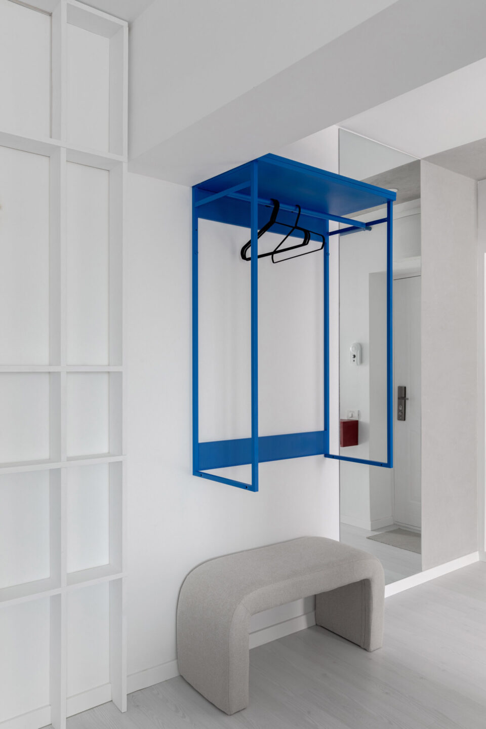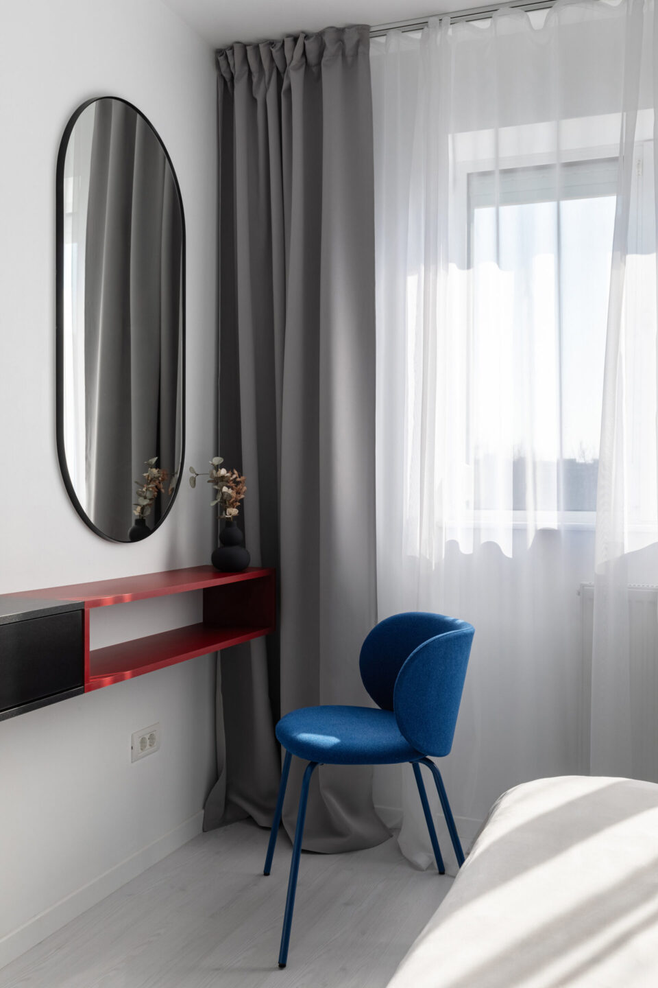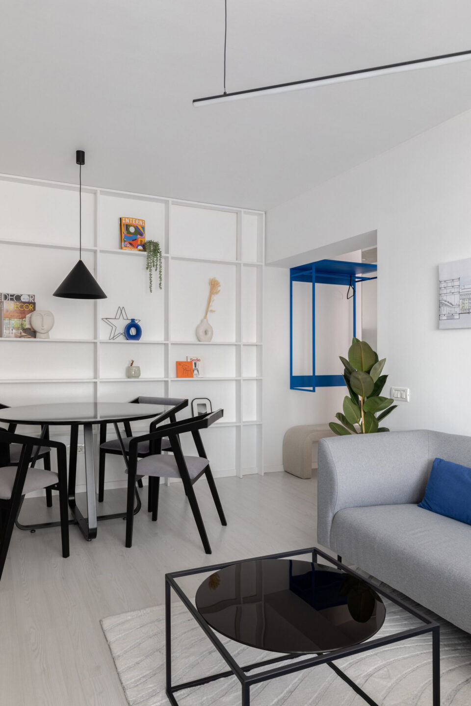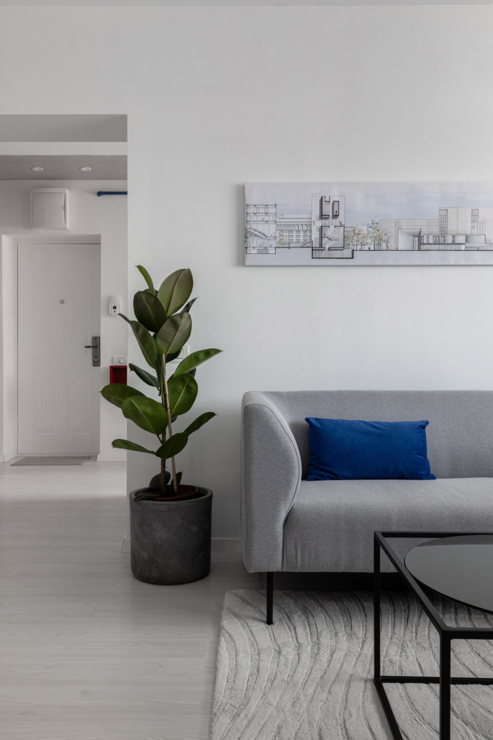 Deși locuința este gândită într-un registru simplu, calm și coerent, totul este legat subtil de o nuanță de albastru care se regăsește aproximativ în proporție de 5% în amenajare. Este firul colorat care unește spațiile și le oferă personalitate fără să încarce vizual.