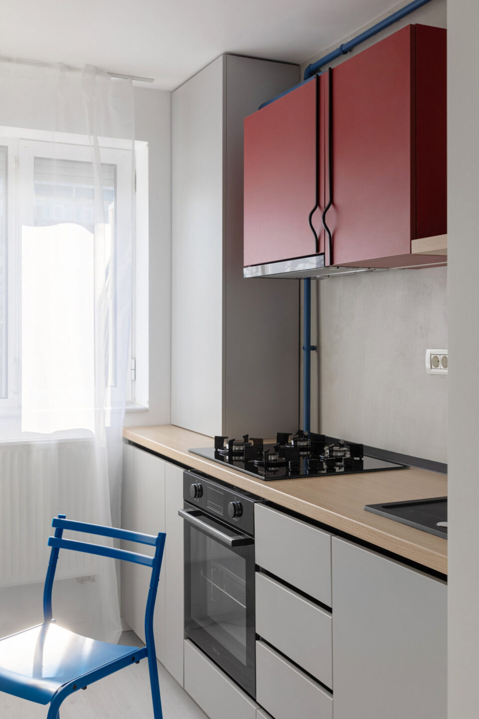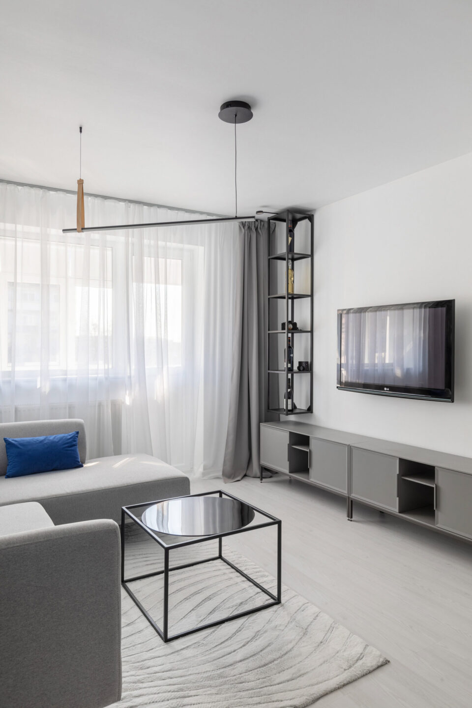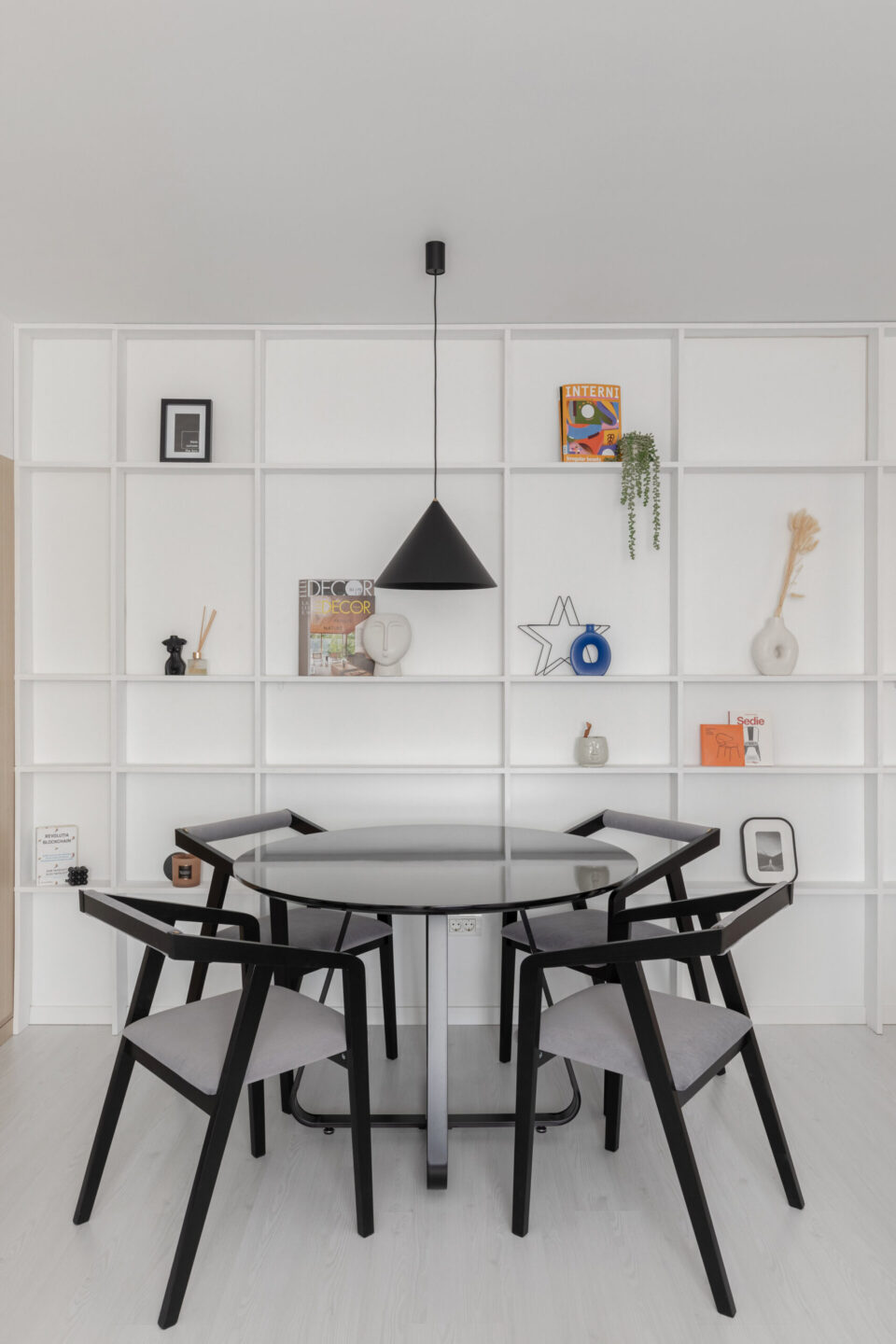 Apartamentul avea o suprafață utilă redusă, două debarale, multe uși și o compartimentare care obliga trecerea dintr-o cameră în alta ca printr-un labirint. Din acest motiv, cei doi – arhitecta Ștefania Tapalagă și inginerul Alexandru Nica de la YESTOart studio – și-au dorit să deschidă spațiul vizual, să-l facă mai coerent și mai ușor de folosit. Funcționalitatea, ergonomia și simplitatea au devenit priorități.