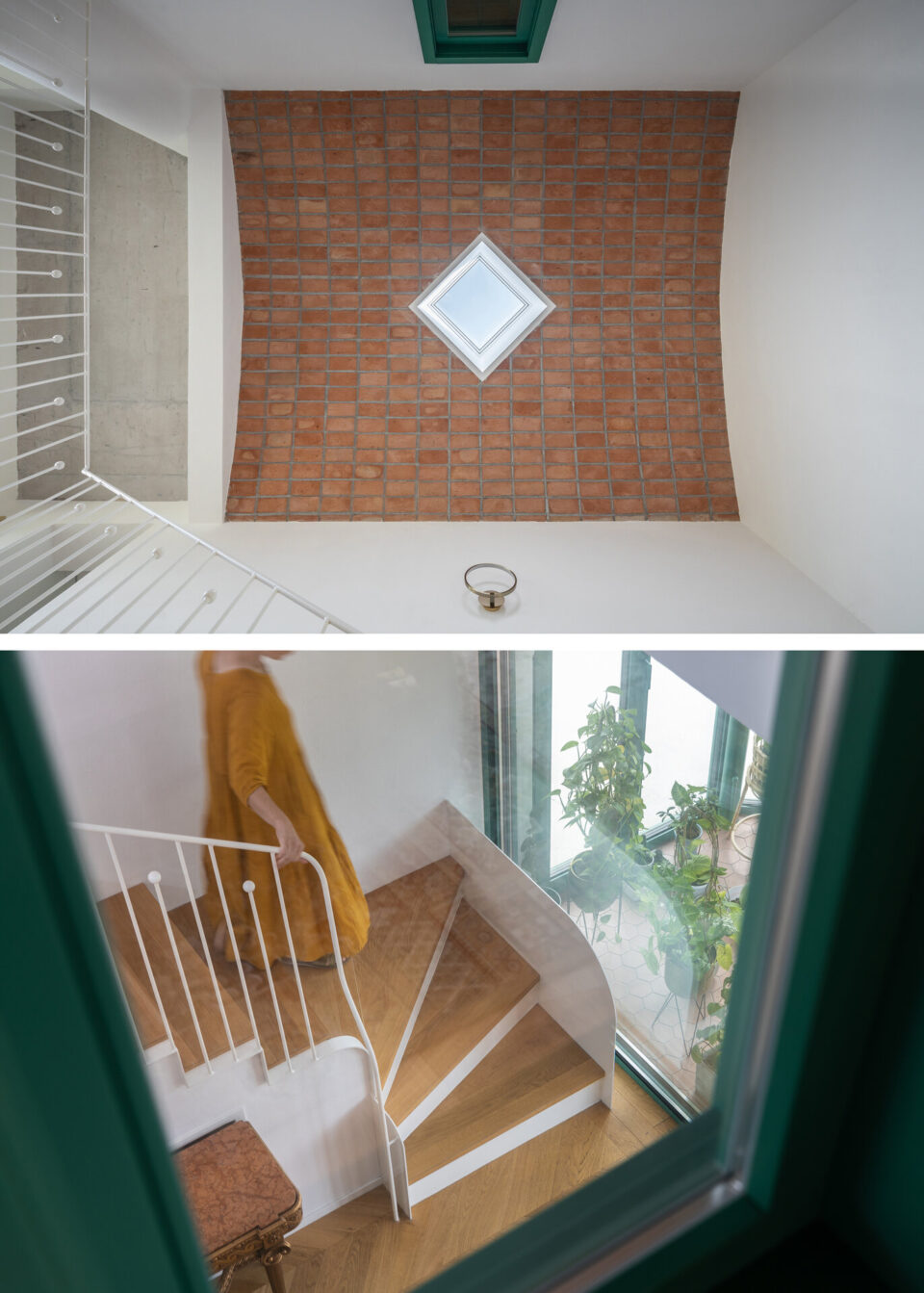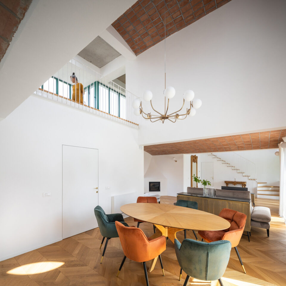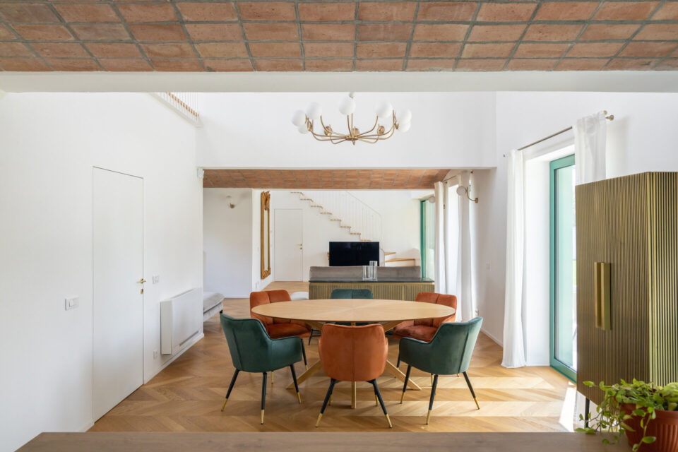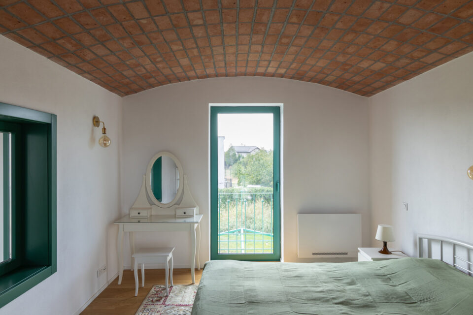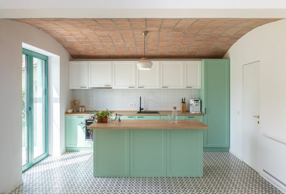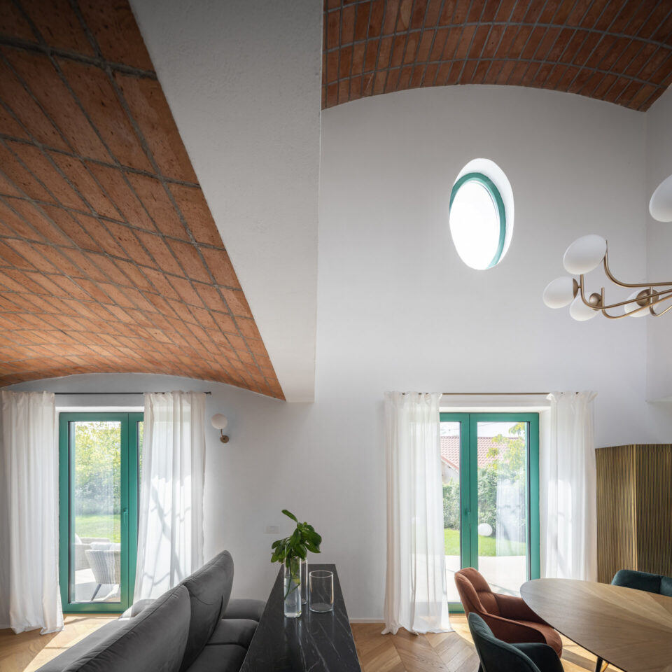 Fundalul neutru deschis primește căldura cărămizii în primul rând prin tavanele boltite, construind un areal care Toscana nu mai pare atât de departe. Bucătăria capătă un ușor vibe retro prin pardoseala cu model repetitiv, care păstrează neutralitatea în contextul unei case unde accentul de culoare este un verde turcoaz cu note pe alocuri diafane.