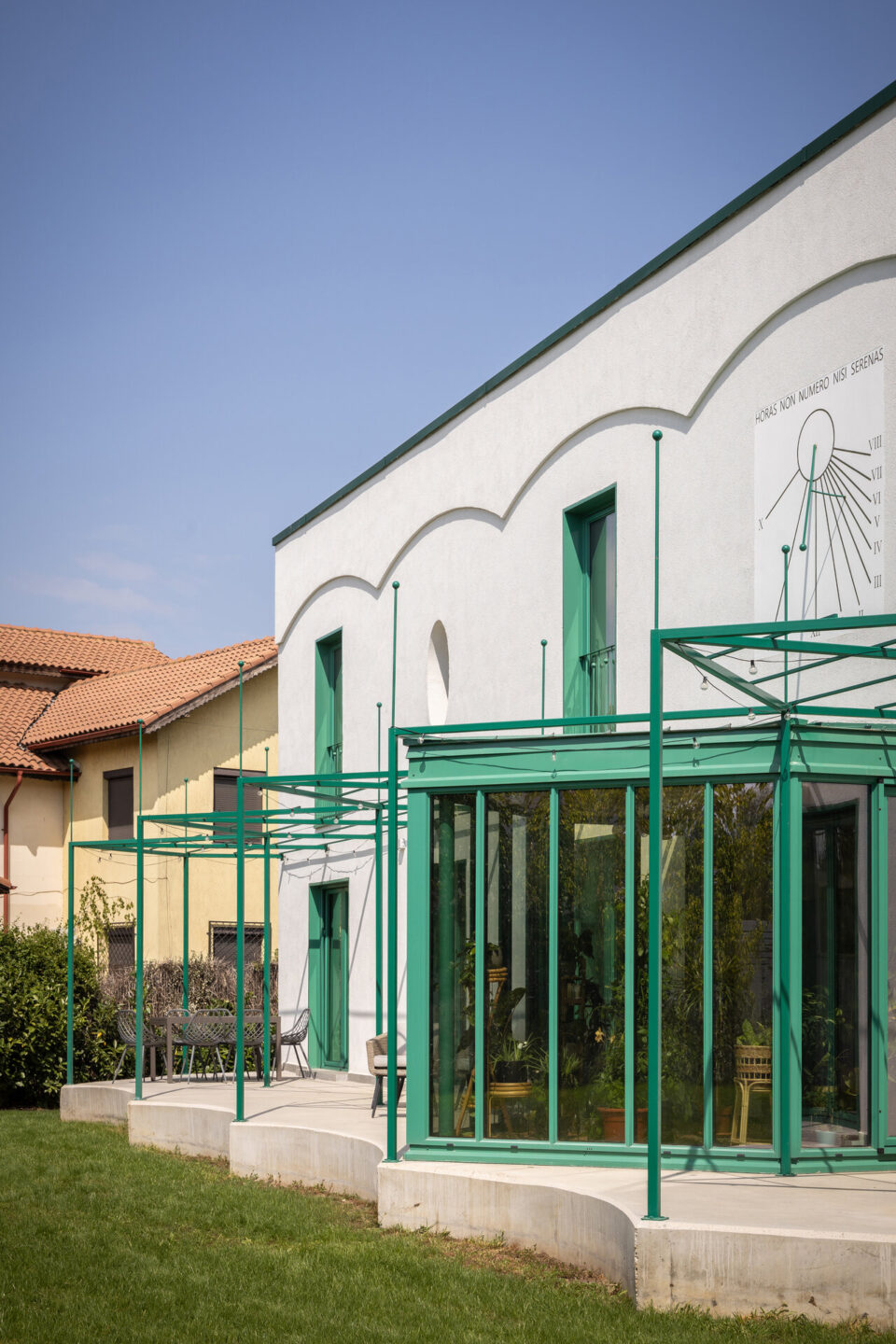 A doua fațadă – cea din spate – degajă o solemnitate mai domoală, asemenea celei a unei vile toscane, instalată echilibrat într-o atemporalitate care lasă în urmă lumea și se abandonează grădinii, din umbra imperfectă a baldachinelor înveșmântate în plante agățătoare.