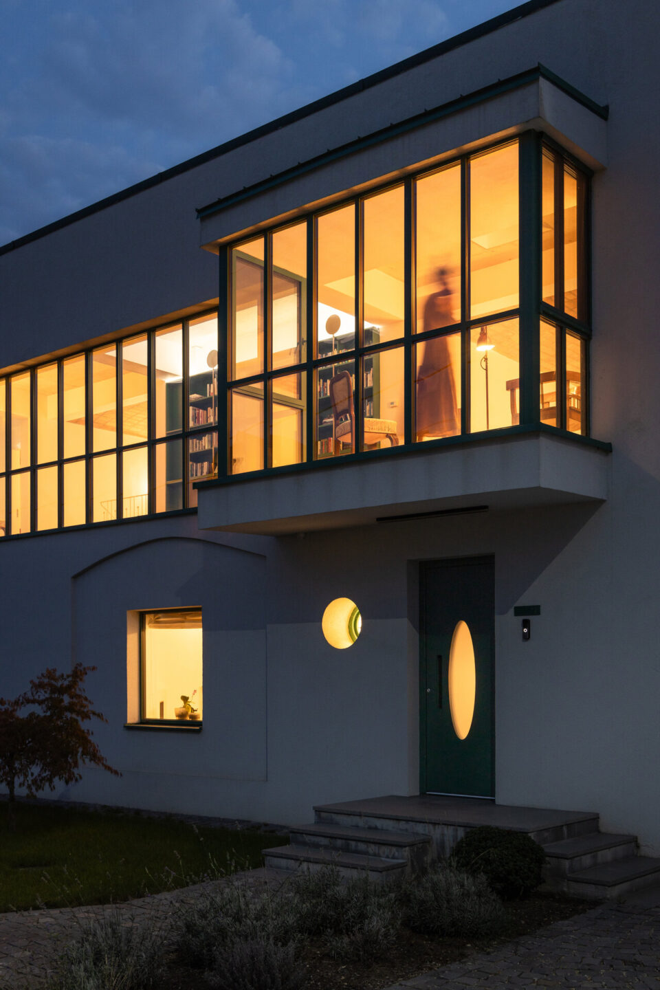 Apoi, există un joc al ambivalențelor care rezidă în diferența substanțială dintre fațada la stradă a casei și cea dinspre grădină. Prima este masivă, expunând galeria cu geamlâc a etajului, care aduce în interior lumina răsăritului și care, seara, lasă la vedere bolțile libere ale etajului.