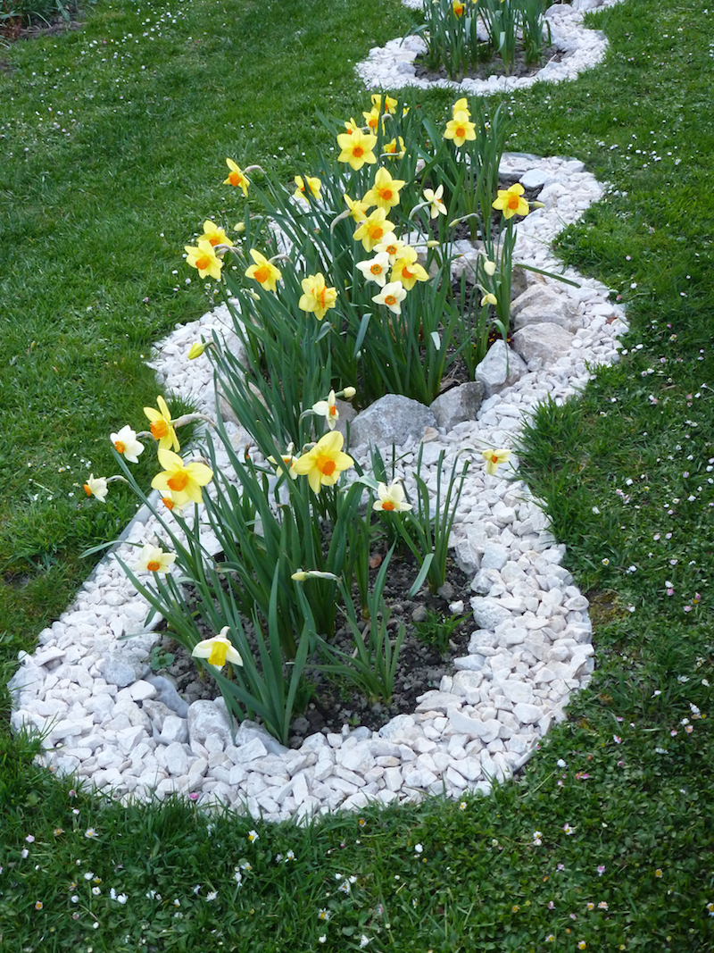 Chenarul de pietriș alb în contrast ferm cu verdele ierbii și al frunzelor subliniază conturul rondului și frumusețea grupurilor de narcise. Ca să nu răsară printre pietre nici iarbă, nici buruieni, pune sub ele o folie.