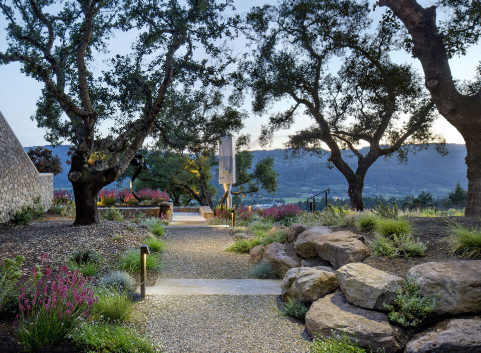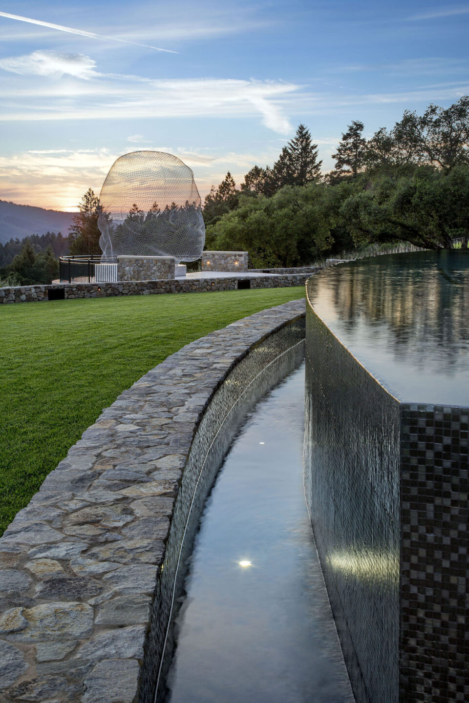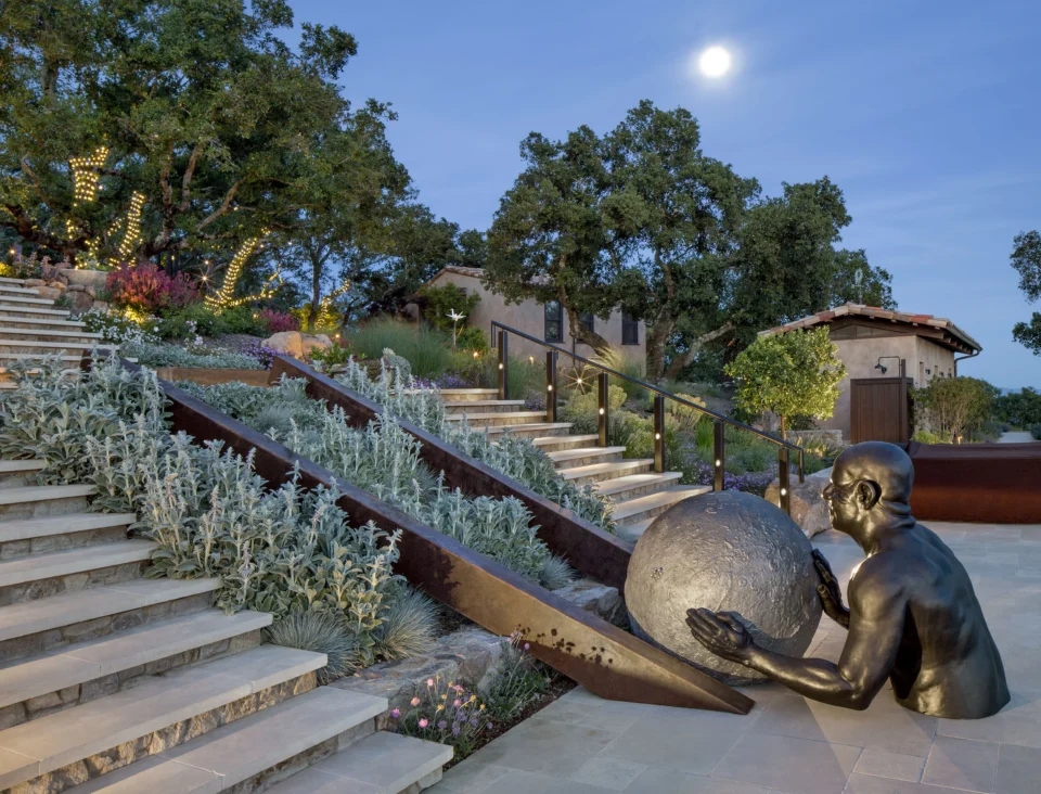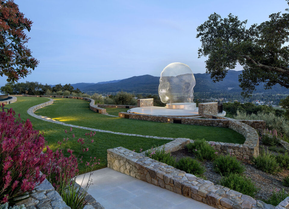În orașul Sfânta Elena, în zona viticolă Napa Valley din California, o amenajare peisagistică gândită în jurul pasiunii pentru sculptură construiește contextul necesar pentru fiecare operă de artă din colecția eclectică expusă în grădină. Această amenajare exterioară a fost concepută de cunoscuta firmă americană de peisagiști Arterra Landscape Architects pentru a construi un cadru adecvat unei colecții eclectice de sculpturi, creând decoruri unice pentru fiecare. Grădina extinde în exterior amenajarea unei reședințe în stil mediteranean, reamenajată pentru un cuplu pasionat de artă. Una dintre sculpturile din seria Arborele Ai Weiwei – cunoscut artist chinez contemporan care evocă, prin această serie, diversitatea umană – parcă plutește deasupra unei fântâni placate cu negru. O altă întindere de apă este piscină cu margine disipată spre uscat, care constituie fundalul pentru o variantă a sculpturii Înclinat de David Phelps. Opera – creată inițial pentru Oklahoma City și expusă în original acolo – este construită din oțel și piatră și invocă mitul lui Sisif pentru a evoca munca muncitorilor din cartierul Bricktown din orașul capitală a statului american Oklahoma. Iar zidurile curbilinii din piatră conturează un amfiteatru, ca o scenă pentru compoziția Ceață de Jaume Plensa, una din piesele iconice ale sculptorului spaniol. Plantele colorate, rezistente la secetă și gândite să populeze peisajul pe toată durata anului, piatra nativă și coronamentul existent al stejarului unifică elementele locului, echilibrând contemplativul cu grandiosul. Amenajarea se completează cu o seră și cu o grădină de legume, îmbinând esteticul cu funcționalul într-un spațiu care permite desfășurarea pe toate planurile. Aceastǎ amenajare exterioara a fost premiată cu Luxe Red Award – Cel mai bun peisaj regional, în 2022. Foto: Cesar Rubio / Paul Dyer CITEȘTE ȘI: Poezia unei grădini cu vedere spre Oceanul Pacific, unde sălbăticia este doar aparentă Sport, natură și convivialitate: cum a fost amenajată o curte de aproape 1.000 mp Grădină iconică pentru o casă celebră, în Los Angeles Distribuie articolul pe: