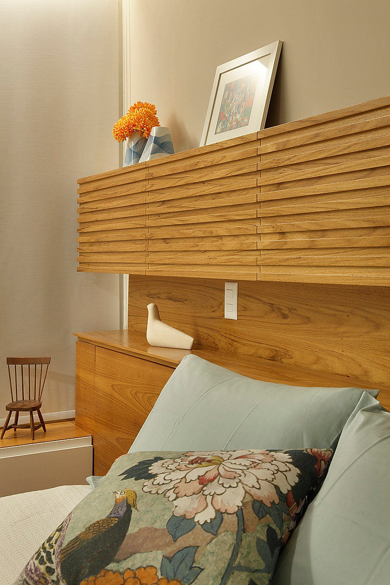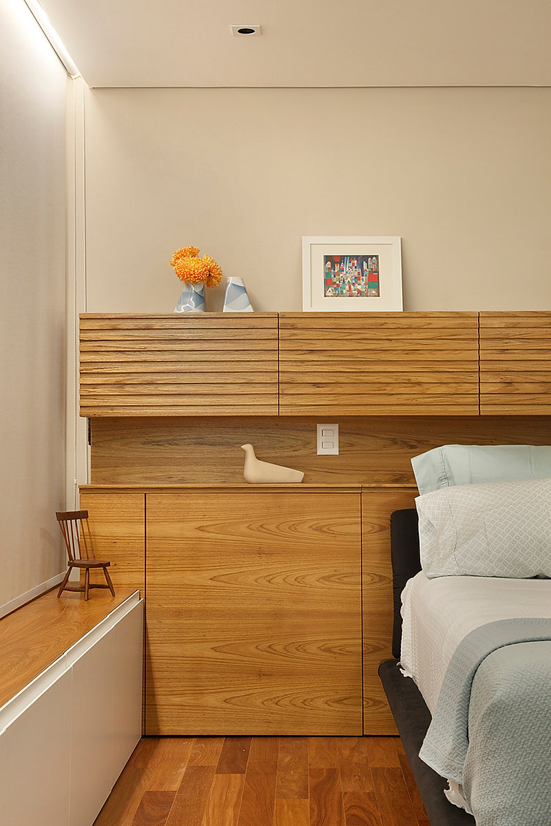 Stilul simplu și modern se extinde și în dormitorul matrimonial, unde – ca și în camera copilului – lemnul natur imprimă confort și familiaritate amenajării.