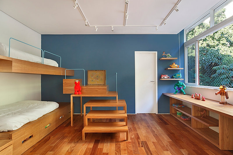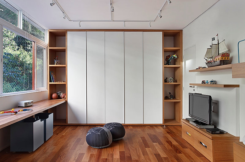 Camera copilului a fost unul din locurile din acest apartament unde arhitecții s-au bucurat cel mult să lucreze: mobilierul a fost integral gândit pentru a integra joaca, iar culoarea completează designul în mod dinamic și original.