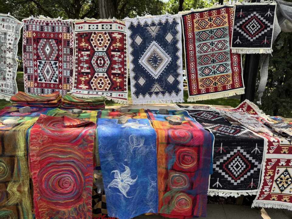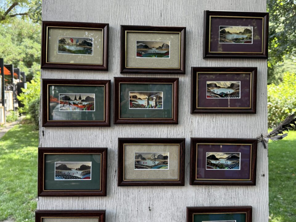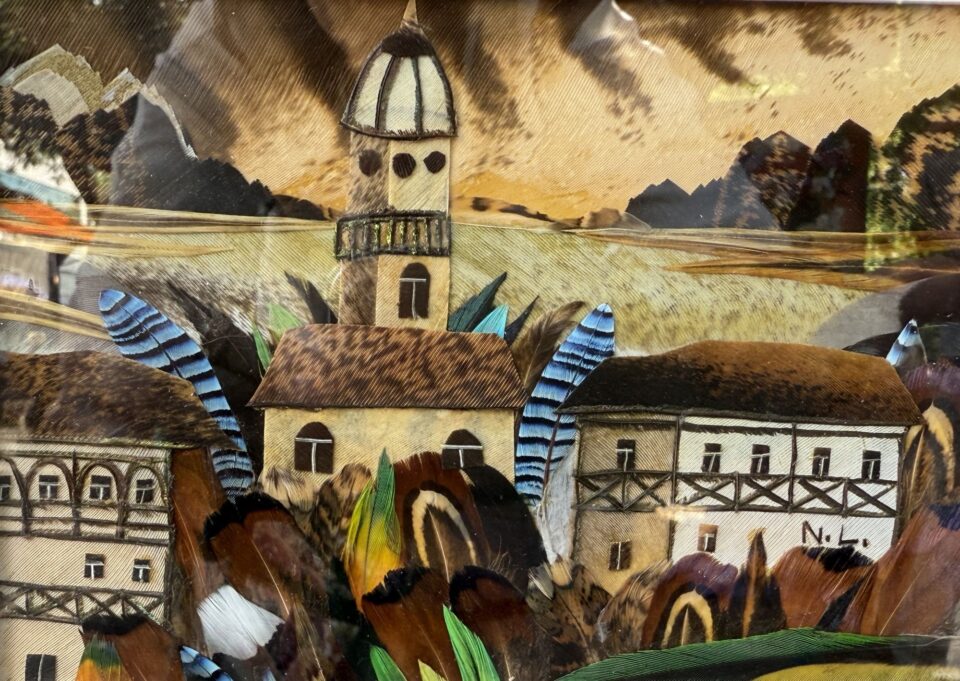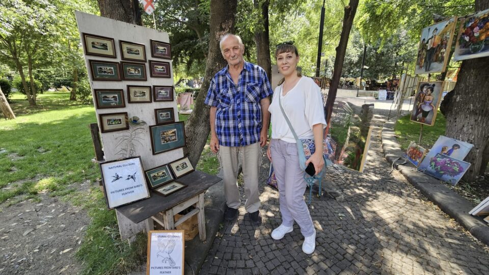Printre zecile de tablouri, covoare, bijuterii și creații de tot felul, mi-a atras atenția o serie de tablouri mici, frumos colorate care aveau ceva diferit. Am descoperit cu uimire că erau tablouri realizate cu pene de păsări! Lângă ele era chiar autorul lor, Nukri Lekveishvili