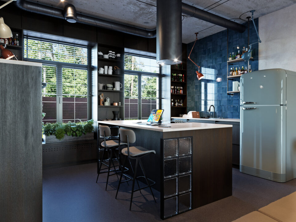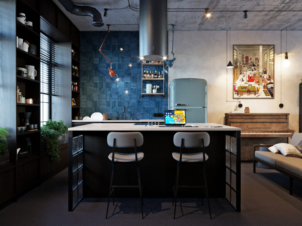 Printre elementele definitorii ale amenajării se numără volumele monolitice închise la culoare, care ascund depozitarea și reduc dezordinea vizuală. Liniile sunt clare, iar spațiile rămân curate și calme. Tavanul din beton aparent, completat de grinzi și șine de iluminat, introduce o notă arhitecturală industrială, ce contrastează subtil cu texturile mai calde. Iar personalizarea omniprezentă a designului conferă spațiului atitudine și identitate, indicînd prezența unei vieți pline.