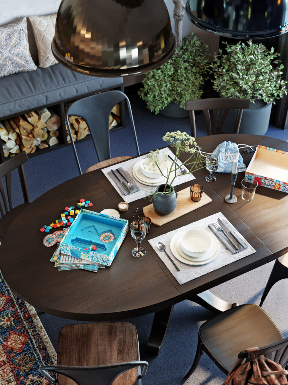 Zona de dining este integrată firesc în acest ansamblu și susține atât viața de familie, cât și momentele dedicate oaspeților. Iluminatul cald, cu corpuri suspendate, precum și mixul ușor eclectic de mobilier creează un echilibru între eleganță și confort.