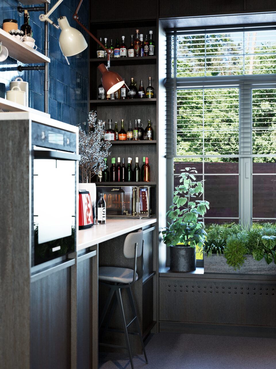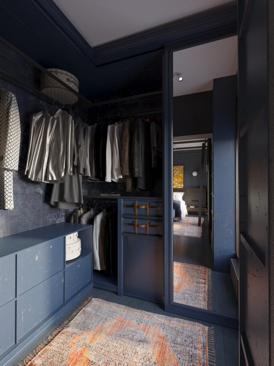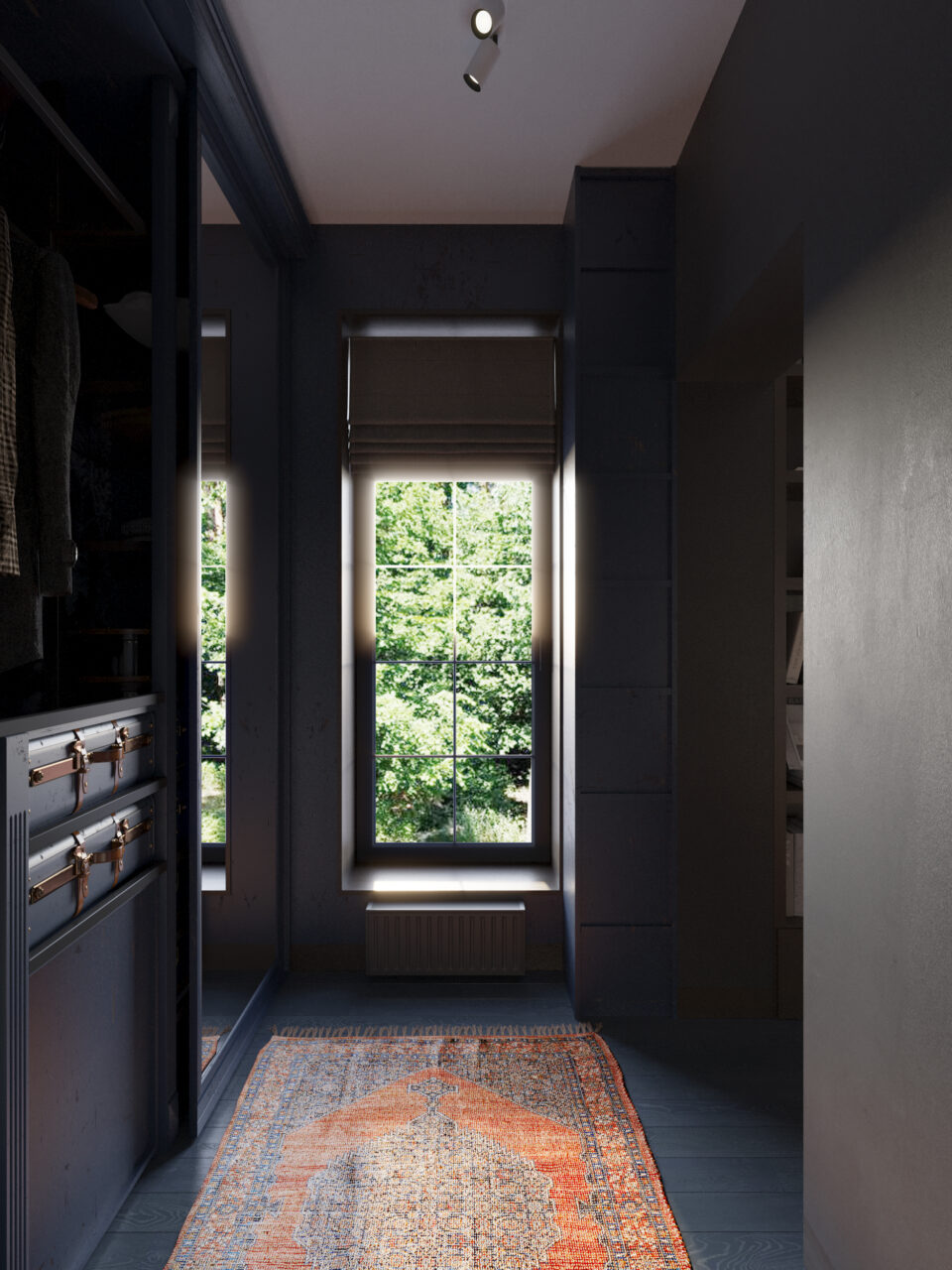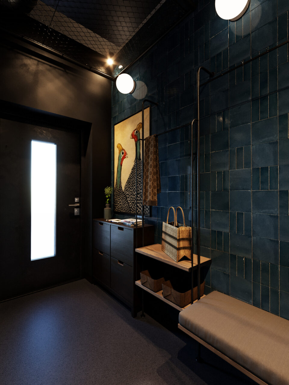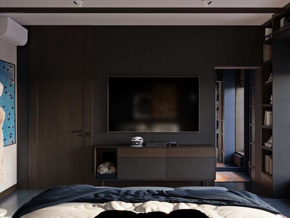 Deși paleta cromatică este dominată de tonuri închise, apartamentul nu devine apăsător și nici întunecat. Ferestrele generoase, iluminatul stratificat și suprafețele cu reflexii subtile păstrează echilibrul și adaugă profunzime. Întunericul este folosit aici ca instrument de construcție a rafinamentului, nu ca element dominant.