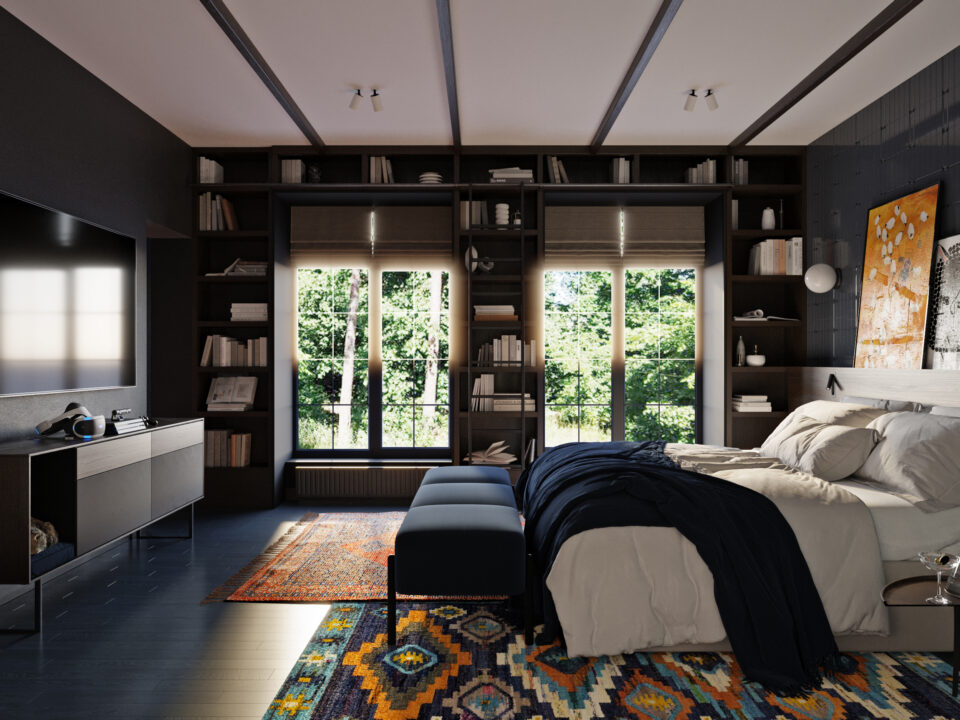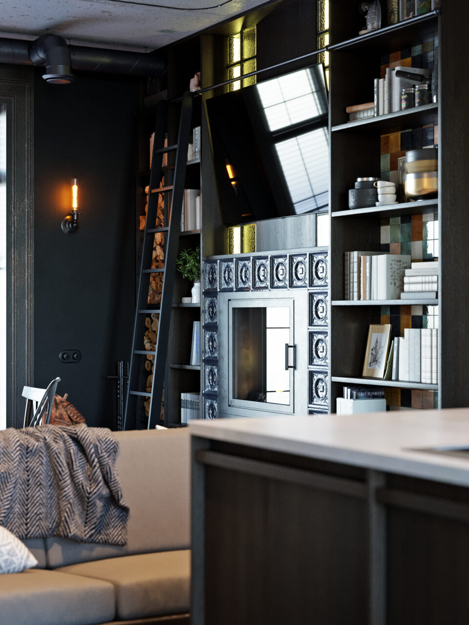 Zona de living este definită de elemente decorative în tonuri închise și de un șemineu care funcționează drept punct de atracție vizuală și emoțională. Aici, atmosfera este intimă, potrivită pentru seri liniștite sau weekenduri petrecute acasă. În apropiere, un perete – bibliotecă cu scară transformă depozitarea într-un gest arhitectural asumat, oferind încăperii aerul unui studio creativ.