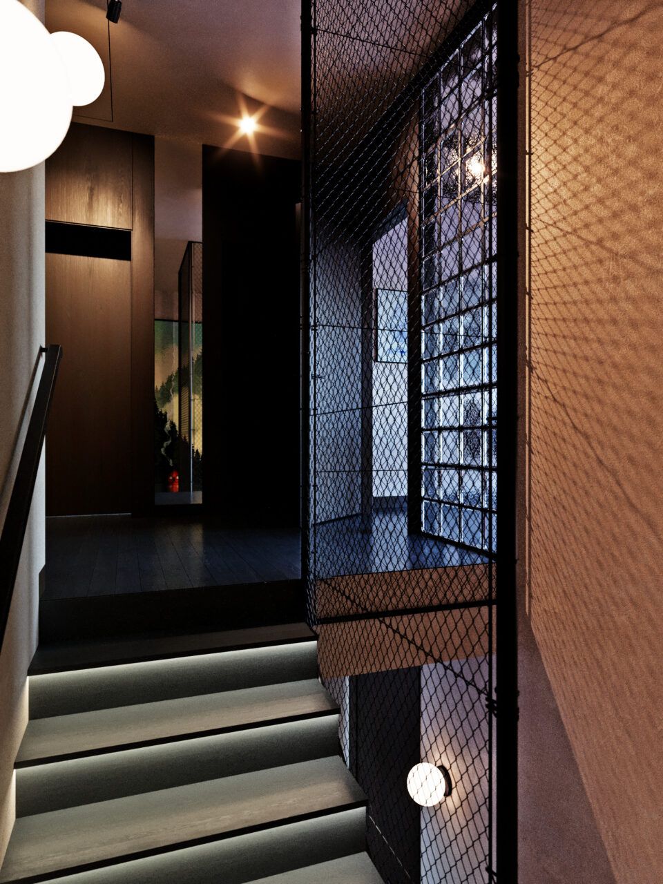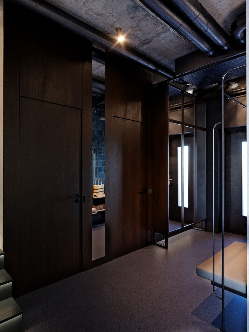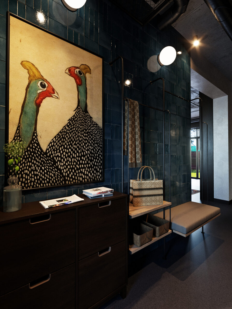 Această locuință de 160 m² din Bucha – amenajată de Oleksii Bezkorovainyi și Iryna Purtova de la Genesis Design – a fost concepută ca o cabană modernă cu o coloană vertebrală de tip loft: linii arhitecturale puternice, umbre adânci și materiale tactile – dar niciodată reci sau cu aspectul perfect al celor dintr-un showroom. Interiorul este intenționat melancolic și masculin, fiind îndulcit de iluminatul cald, texturile naturale, piesele vintage și de suprapunerea jucăușă a unor piese de artă.
