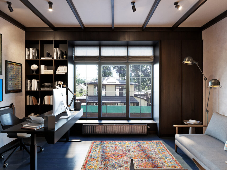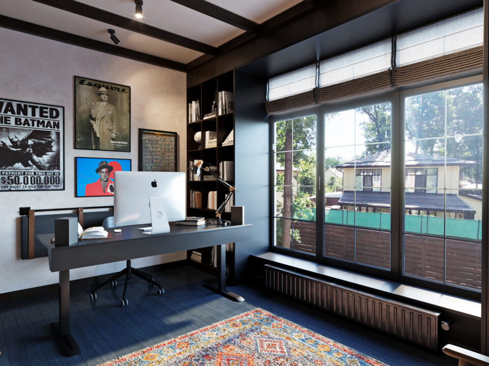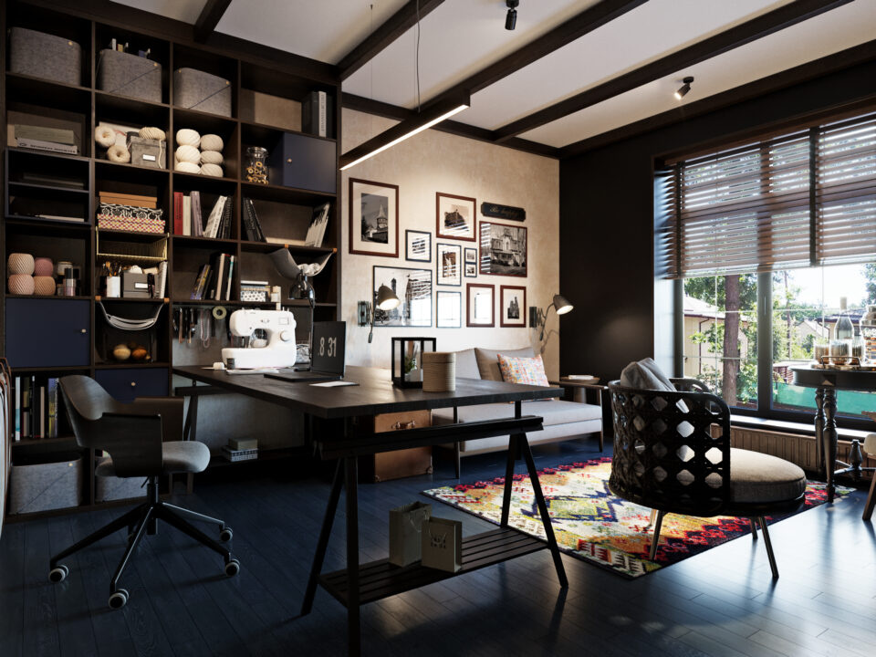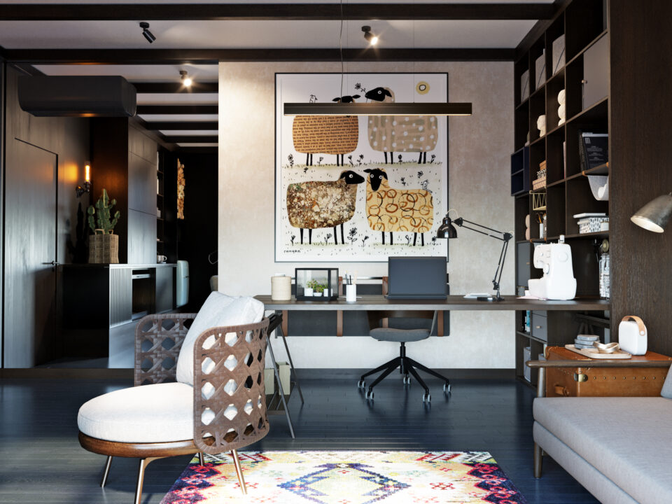 În același spațiu a fost integrat și un colț de lucru, astfel încât activitățile zilnice să nu necesite o cameră separată, aceasta fiind o soluție practic și discretă, care păstrează coerența designului.