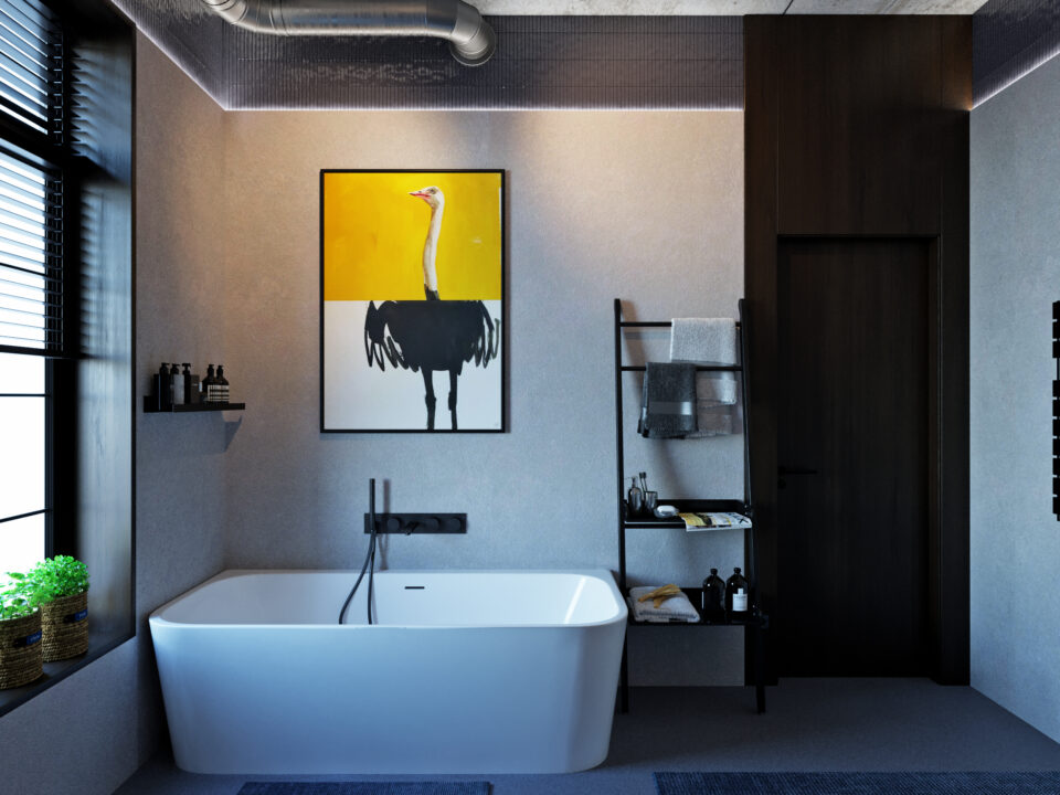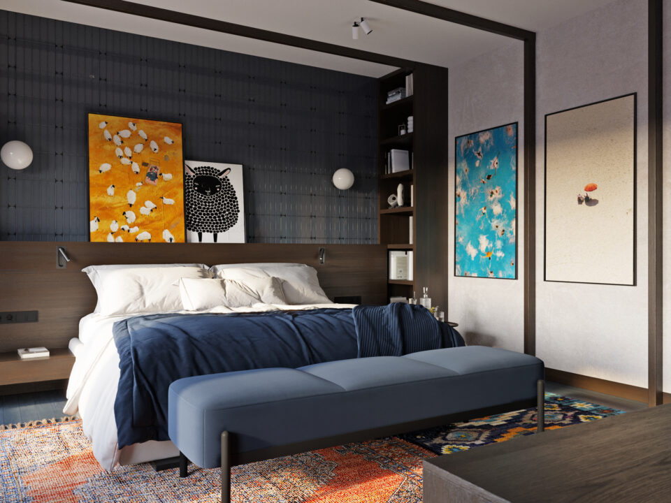 Personalitatea apartamentului este susținută și de un stil artistic avangardist: pereți galerie, imprimeuri grafice și piese neașteptate completează decorul fără a-l încărca. Pereții despărțitori din blocuri de sticlă permit luminii să circule, oferind în același timp intimitate și o notă vintage reinterpretată într-o cheie modernă.