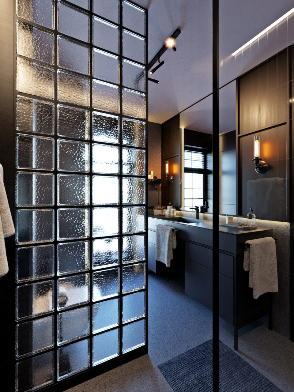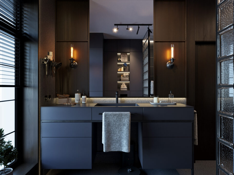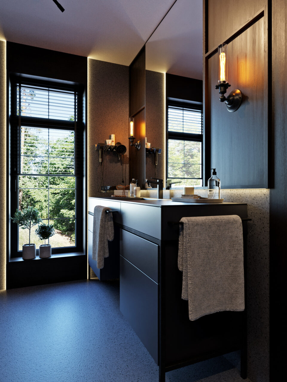 Băile continuă aceeași estetică: mobilier în tonuri închise, nișe iluminate discret și suprafețe durabile, gândite pentru un „confort hotelier privat”. Iluminarea este atent calibrată pentru a pune în valoare atât spațiul, cât și pe cei care îl folosesc.