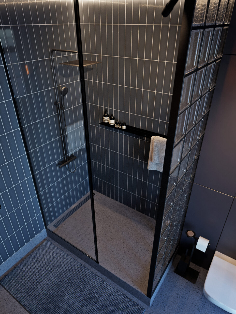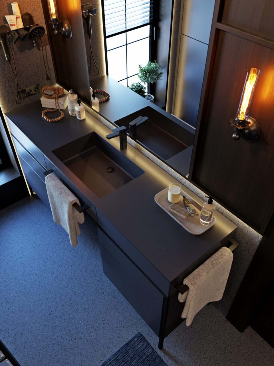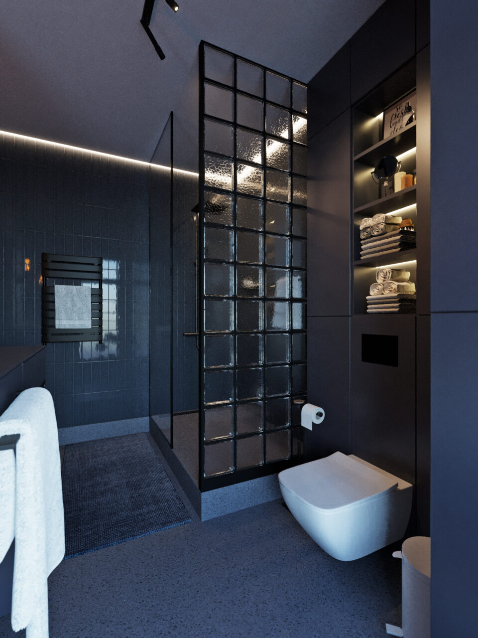 Băile continuă aceeași estetică: mobilier în tonuri închise, nișe iluminate discret și suprafețe durabile, gândite pentru un „confort hotelier privat”. Iluminarea este atent calibrată pentru a pune în valoare atât spațiul, cât și pe cei care îl folosesc.