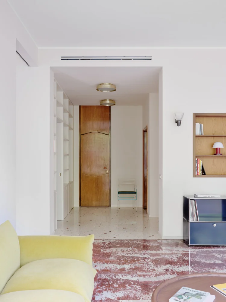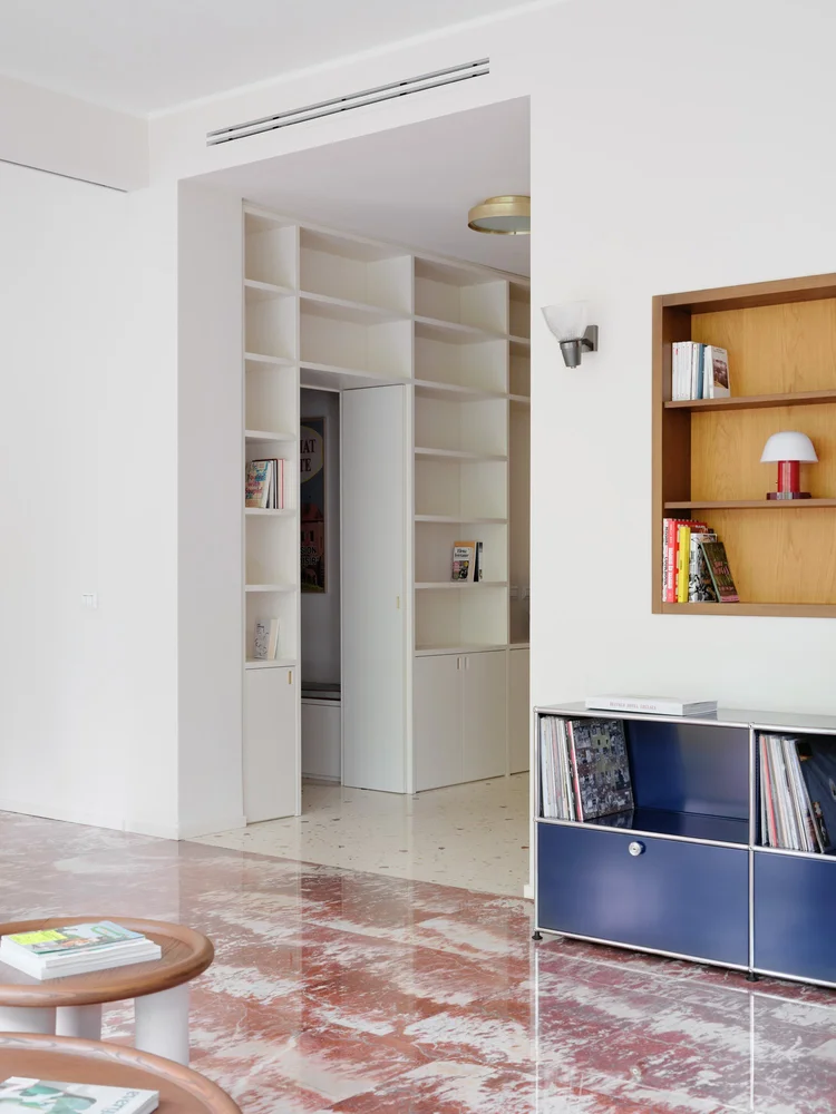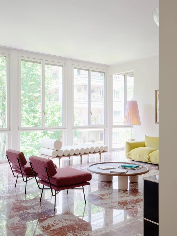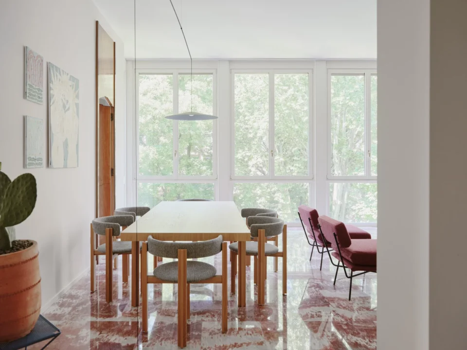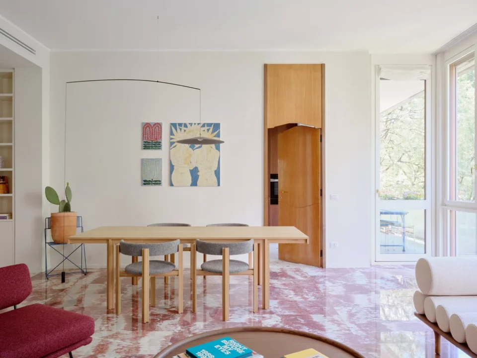Acest apartament de lux de 250 de metri pătrați se află într-o clădire construită în anii 1960, într-o zonă elegantă a orașului Milano. Cu ferestre mari specifice perioadei mid-century, apartamentul a fost renovat într-o formulă care menține o parte din finisajele inițiale, completate cu o pardoseală din marmură care face legătura între trecut și designul contemporan. Renovare în jurul pieselor care vorbesc despre istoria casei Încă de la început, legătura emoțională a proprietarului cu locuința a influențat multe dintre alegerile făcute de designerii de la Valencia Biscottini, care s-au ocupat de proiect. Cel mai relevant exemplu este pardoseala din living, realizată din marmură Rosso Francia și care, în loc să fie înlocuită, a fost păstrată și pusă în valoare. Mai mult decât atât, a devenit punctul de plecare pentru noua pardoseală din terrazzo, adăugată în timpul renovării și gândită ca o punte între trecut și prezent. Un alt detaliu cu valoare sentimentală îl reprezintă ușile din lemn desenate de bunicul proprietarului, alt element care a fost reinterpretat în cursul renovării. Detaliile originale au fost readuse la viață și integrate în noile uși glisante lăcuite, care separă zona de living de camera TV. Astfel, trecutul nu a fost șters, ci adaptat într-o formă actuală. Intrarea în apartament se face direct din lift, iar primul impact este unul puternic. Spațiul este luminos și aerisit, iar pardoseala din terrazzo atrage imediat atenția. Aceasta a fost realizată de Fantini Mosaici, o companie istorică din Milano: pe un fundal bej, desenul prinde viață prin mici bucăți de marmură în nuanțe de Rosso Francia, Giallo Siena și Bardiglio gri-albăstrui. Fiecare piesă a fost aleasă și montată individual, iar rezultatul aduce un material tradițional într-o zonă modernă și sofisticată. Pentru a echiibra bogăția vizuală a pardoselii, pereții au fost păstrați într-o nuanță neutră – un bej cald, ușor prăfuit, care, în lumina naturală revarsată prin ferestrele generoase, capătă accente discrete de roz. Aceeași finisare a fost folosită și pentru bibliotecile realizate la comandă în zona de intrare. În interiorul uneia dintre ele se ascunde o ușă dublă care duce către o mică baie pentru oaspeți. Acest spațiu surprinde prin pereții acoperiți cu un email roșu intens, o alegere cromatică ce face trimitere la marmura Rosso Francia, dar într-o interpretare mai vibrantă și actuală. Pardoseala din terrazzo continuă în holuri, bucătărie și zonele de serviciu, asigurând unitate vizuală. În dormitoare, aceasta este înlocuită de un parchet elegant din stejar masiv, montat în model italian „spic”, completând cu o componentă mai caldă, primitoare eleganța pardoselii minerale. Un element spectaculos al zonei de living îl reprezintă ferestrele ample, de la podea până la tavan, care oferă vedere către o grădină plină de copaci. Lumina naturală joacă un rol esențial în definirea atmosferei, punând în valoare texturile și culorile alese. Mobilier cu vibe iconic, într-un cadru cu rezonanță Mid-Century Și mobilierul urmează același principiu al continuității și reinterpretării. Au fost alese piese de design cu istorie, dar adaptate prin culori și finisaje contemporane. În living, canapeaua Marenco – un icon al mobilierului italian din anii 70 – se îmbracă în galben. Lângea ea, canapeaua albă Five to Nine proiectată de Studiopepe pentru Tacchini este un alt omagiu adus designului italian. Alături de ele, scaunele de dining, biblioteca sau accente albastre completează schema funcțională a mobilierului. Paleta cromatică este luminoasă și proaspătă, cu tonuri calde de galben, albastru pal, roz și marsala care continuă roșul natura al pardoselii din marmură, oferind întregului apartament un aer rafinat, dar prietenos. Foto: Francesca Iovene CITEȘTE ȘI: Arhitectura dualității la Poznan: două lumi într-o locuință cu vibe retro Într-o vilă din 1822, contemporanul capătă un nou sens în amenajare Diversitatea urbană și pasiunea pentru Maroc, reflectate într-o vilă de lux cu influențe etnice Distribuie articolul pe: