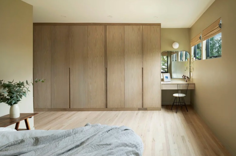 Dormitorul este simplu și calm, decorat în tonuri naturale. Mobilierul integrat, dulapul mare din lemn și măsuța de toaletă arată cât de mult contează ordinea și funcționalitatea într-o casă mică, dar bine gândită.