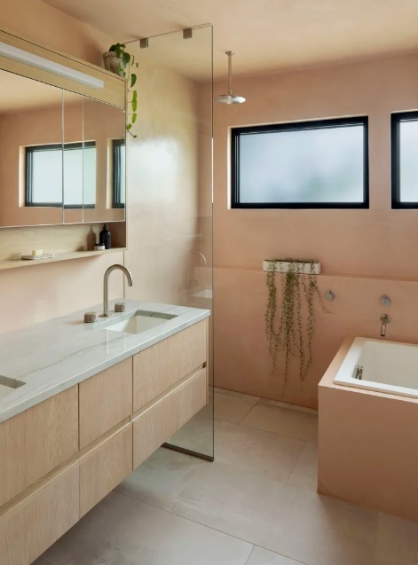La etaj, arhitecta a reorganizat spațiile astfel încât locuința să devină mai practică pentru o familie. A fost adăugat un nou spațiu de depozitare și o baie frumoasă, realizată tot cu tencuială decorativă.
