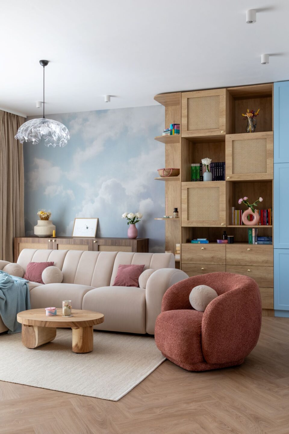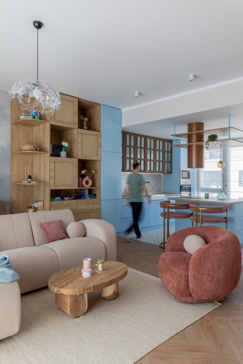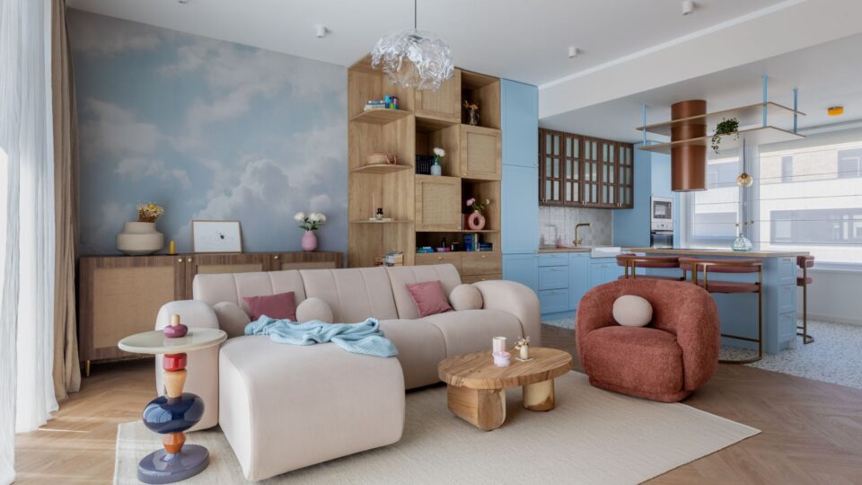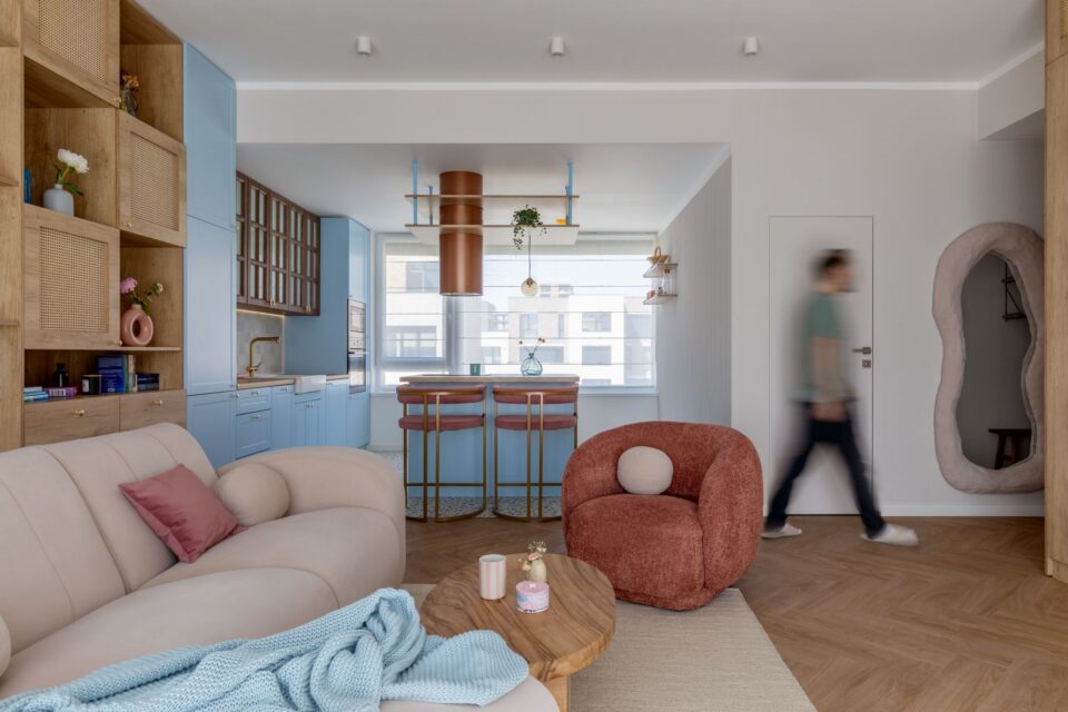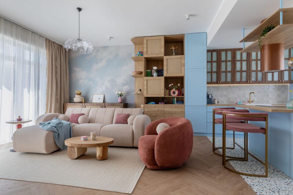 Într-un complex rezidențial din nordul Capitalei, un apartament cu o suprafață utilă de 60 mp oferă o atmosferă caldă și liniștitoare, inspirată de nuanțele blânde ale cerului la apus, transpuse în texturi naturale și confortabile. Atmosfera aproape visătoare din acest apartament este ușor construită prin tonuri calde, texturi naturale și accente delicate, în care se regăsesc culorile difuze și liniștitoare ale cerului roz-albastru la apus. De aici a și venit numele proiectului – Cotton Candy Sky, spune Diana Bibina, fondatorul Julie Design și designerul de interior care s-a ocupat de proiect. Zona de zi este un spațiu generos, în care livingul și bucătăria se contopesc într-un open space armonios, în jurul căruia s-a construit întreaga poveste a casei. Bucătăria: modificări în faza de șantier pentru a adapta spațiul la nevoi Lemnul deschis din apropierea canapelei se închide spre bucătărie, corelat cu nuanța roșcată a hotei suspendate și a scaunelor din zona de bar. Apare un contrast moderat, cu o dinamică ușoară, adecvată într-un spațiu precum bucătăria. Pentru a integra hota suspendată deasupra insulei, dar și pentru a ascunde tubulatura, a fost extins și adaptat tavanul. Întreaga structură a fost ascunsă în plafon, obținând o estetică curată și coerentă. Un detaliu special din zona de trecere dinspre bucătărie spre hol este oglinda cu ramă din ipsos – un obiect unic realizat pentru acest proiect chiar de echipa de design și care aduce o notă artizanală și personală amenajării. Un dormitor relaxant ca o plimbare la munte Dormitorul poartă amprenta beneficiarei: un tapet spectaculos cu imaginea unei păduri care reflectă pasiunea ei pentru drumeții și natură. Atmosfera este completată cu texturi naturale și iluminat după mai multe scenarii, de la lumină ambientală difuză și până la accente direcționate. Detaliile nevăzute care construiesc confortul Au existat detalii ce a trebuit să fie planificate din faza de șantier pentru a asigura gradul de confort dorit la final, dar și integrarea în conceptul designului. Astfel, s-au făcut modificări la rețeaua electrică, pentru a amplasa corpurile de iluminat și prizele exact acolo unde susțineau cel mai bine conceptul vizual. De asemenea, pompa de căldură a fost mascată prin mobilier realizat pe comandă, menținând accesul facil pentru întreținere. Un alt aspect a privit proiectarea a suficiente spații de depozitare, pentru ca cei 60 mp să fie utilizați la maximum și cu eficiență, iar apartamentul să nu pară aglomerat, ci să respire. Cea mai vizibilă transformare a fost înlocuirea parchetului gri existent cu un LVT în tonuri calde de stejar, în model herringbone, care reflectă frumos lumina naturală și completează armonia generală a spațiului. În zona bucătăriei, LVT-ul continuă cu un model jucăuș de terrazzo, adăugând o notă de dinamism. Cât privește texturile, catifeaua, cânepa naturală, ratanul și lemnul formează un dialog subtil între moale și aspru, între lucrat cu grijă și lăsat intenționat imperfect. Alături de volume, linii și lumini, ele contruiesc un echilibru metaforic între vis și concret, între joacă și rigoare, între tehnic și estetic, într-un apartament devenit acasă pentru proprietarii lui. Foto: Sabin Prodan / Tryingtodoart CITEȘTE ȘI: În acest apartament bucureștean cu geometrie alpină, arhitectura a trasat direcția amenajării Într-un studio cochet din Timișoara, compartimentarea pe verticală rezolvă lipsa de spațiu Clasicul contemporan întâlnește modernul, în acest penthouse din nordul Bucureștiului Distribuie articolul pe: