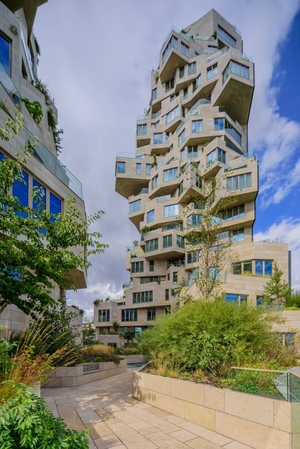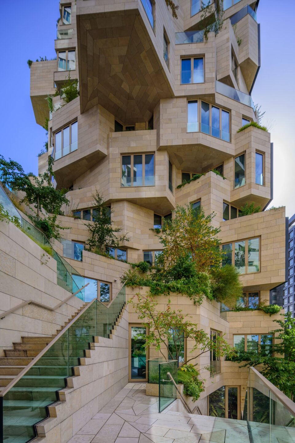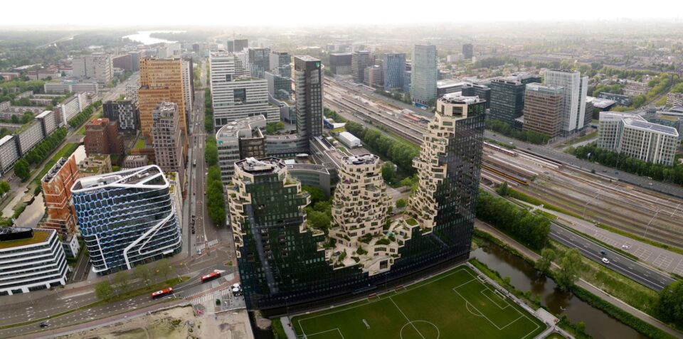 O lume vegetală suspendată între zgârie-nori rupe ritmul sobru al arhitecturii din districtul financiar din Amsterdam. Este Valley, o construcție de inspirație geologică îmbrăcată în mii de plante, creată de arhitecții MDRV. Complexul cumulează funcții diferite – locuințe și spații publice – și susține un întreg ecosistem, care crește în mijlocul orașului și care evoluează de la un anotimp la altul. Proiectat de cunoscuta firmă de arhitectură MVRDV, sub conducerea vizionară a lui Winy Maas, Valley este un exponent emblematic al designului urban modern, pentru a cărui construcție inovația a devenit instrument uzual. Îndrăzneață, sculpturală și diferită de orice altceva din oraș, silueta sa distinctivă, compusă din volume schimbătoare și terase dramatice redefinește orizontul cartierului Zuidas și invită la curiozitate din toate unghiurile. Îmbrăcată în piatră naturală și înmuiată de o verdeață luxuriantă, fațada se simte atât organică, cât și arhitecturală, îmbinând inovația cu respectul pentru mediu. Foto: Ossip van Duivenbode / MDRV Dramatica Valley iese în evidență cu cele trei turnuri ale sale de 67, 81 și 100 de metri și spectaculoasele sale apartamente în consolă. Numită cel mai bun zgârie-nori nou din lume la Premiile Emporis Skyscraper din 2021, clădirea se distinge prin mai multe aspecte. În primul rând, combină birouri, magazine, servicii de catering, facilități culturale și apartamente într-o singură clădire. În al doilea rând, spre deosebire de clădirile închise din alte părți ale cartierului Zuidas în care se află, valea verde care șerpuiește între turnurile de la etajele al patrulea și al cincilea este accesibilă tuturor – deci și nerezidenților – prin intermediul a două scări exterioare din piatră. Foto: Profimedia Proiectată pentru dezvoltatorul Edge, clădirea este o încercare de a readuce o dimensiune verde și umană în mediul de birouri mai puțin ospitalier din Amsterdam Zuidas. Este o construcție cu multiple fețe. Pe marginile exterioare se află o carcasă de sticlă oglindită netedă, care se potrivește în contextul cartierului de afaceri. În interiorul acestei carcase, clădirea are un aspect natural complet diferit, mai primitor, ca și cum blocul de sticlă s-ar fi prăbușit pentru a dezvălui pereți de stâncă abrupți în interior, plini de piatră naturală și verdeață. Diverse locații din complexul cu trei turnuri oferă priveliști uluitoare asupra orașului – apartamentele, desigur, dar mai ales sky bar-ul din vârful celui mai înalt turn, la care vizitatorii au acces prin intermediul magazinului emblematic Molteni de la parter. Dispunerea clădirii este adaptată pentru un amestec de rezidenți, salariați și vizitatori: deasupra parcării subterane cu trei etaje, birourile ocupă cele șapte etaje inferioare, apartamentele fiind situate de la etajul opt în sus. O mare parte a clădirii este deschisă publicului: de la aleea pietonală care șerpuiește în zig-zag până la valea centrală de la nivelul străzii, până la Grotă – un atrium care formează o stradă acoperită la primul etaj. Grota este conectată la exterior prin două luminatoare mari care servesc și ca bazine cu apă puțin adâncă în nivelul văii de deasupra, iar pardoseala, pereții și tavanele din piatră naturală – aceeași piatră folosită pe suprafețele văii și turnurilor – arată clar că toate zonele publice ale clădirii fac parte din aceeași formațiune geologică aparentă. Inovația a fost necesară și în proiectare Proiectarea și construcția clădirii Valley sunt complet personalizate, la aceasta au participat sute de designeri, ingineri, constructori, consultanți. Forma extrem de complexă a necesitat un angajament special față de detaliile fine, care îmbunătățește și mai mult conceptul de design. Experții în tehnologie ai MVRDV au creat o serie de instrumente digitale personalizate pentru a perfecționa clădirea, de la un instrument care asigura că fiecare apartament avea lumină și priveliști adecvate, până la un program care a făcut posibil modelul aparent aleatoriu a peste 40.000 de plăci de piatră de diferite dimensiuni de pe fațadele clădirii. Foto: Profimedia Fiecare dintre cele 200 de apartamente are un plan unic, posibil datorită designului interior realizat de Heyligers Architects. Iar consolele extravagante ale turnurilor sunt posibile datorită ingineriei inovatoare, inclusiv a 11 „piese speciale” din oțel fixate cu șuruburi pe clădirea de beton, care duc aspectul general la un alt nivel. Clǎdirea combină perspective în domeniul sustenabilității, tehnologiei și sănătății. Performanța energetică a clădirii este cu 30% mai bună decât prevǎd reglementările locale. Zona rezidențială a obținut un scor de 8 din 10 pe Scala Clădirilor GPR, un instrument de măsurare olandez care evaluează clădirile pe cinci teme: energie, mediu, sănătate, calitatea utilizării și valoare viitoare. Cele mai noi tehnologii inteligente sunt integrate în spațiile de birouri, inclusiv sisteme de automatizare a clădirilor bazate pe IP și diverși senzori conectați la monitorizarea utilizării reale. Cunoscutul peisagist Piet Oudolf a ales vegetația Arhitectul peisagist Piet Oudolf a dezvoltat o matrice pentru a selecta plantele potrivite pentru fiecare locație din clădire, luând în considerare factori precum vântul, lumina soarelui, temperatura și întreținerea. Foto: Profimedia Copacii, de exemplu, se găsesc în mare parte la etajele inferioare, în timp ce nivelurile superioare susțin în principal plante mici. În total, peste 271 de copaci și arbuști tineri și aproximativ 13.500 de plante mai mici ocupă jardinierele din piatră naturală, reprezentând 220 de specii diferite de plante, oferind locuitorilor și vizitatorilor un peisaj în continuă schimbare d