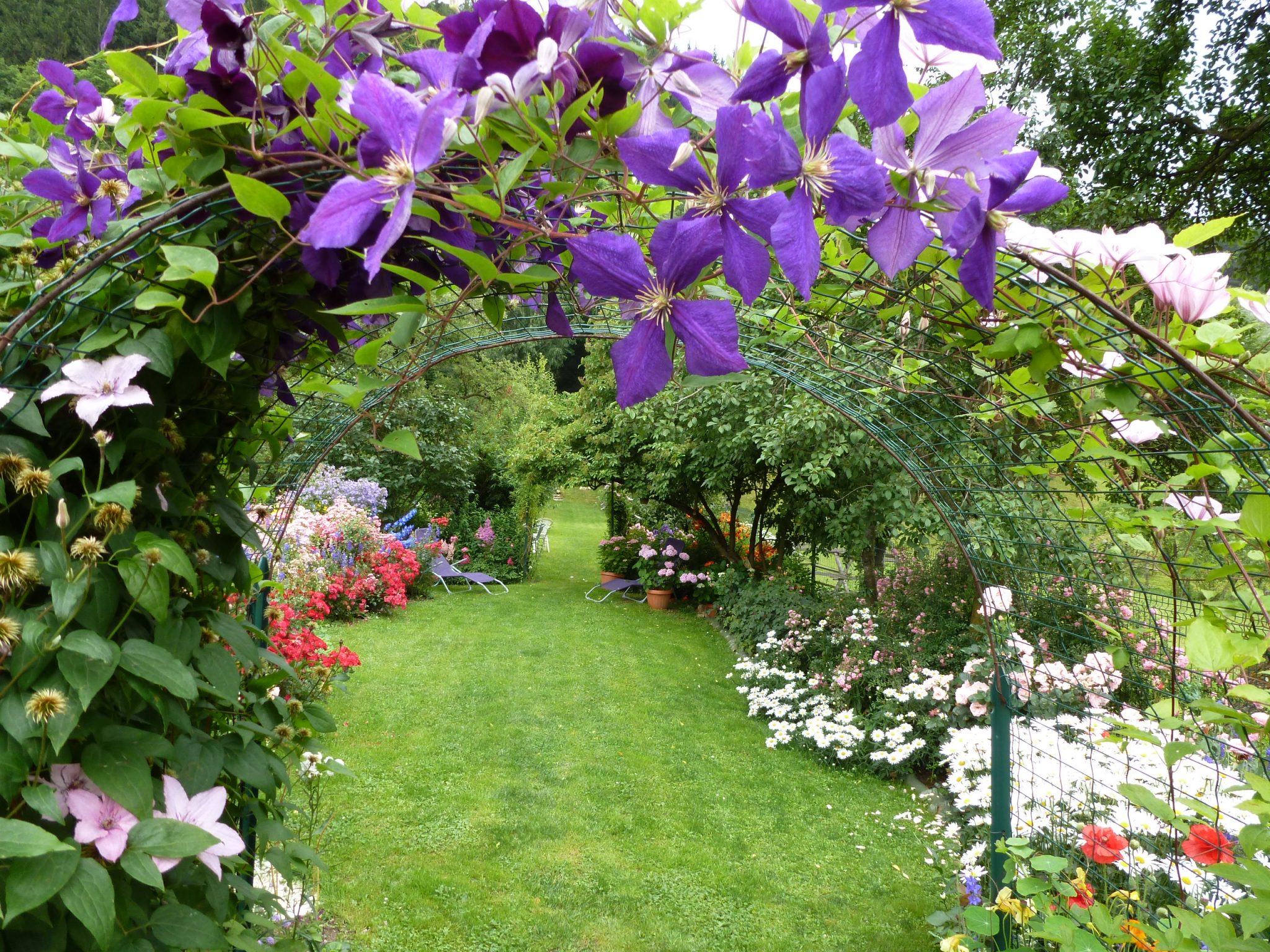 Când sunt mature și în toi, clematitele fac o mare de flori. Pentru ca movul lor văzut în masă să nu fie șocant, au fost împletite pe aceeași boltă cu unele roz și acompaniate în fundal de flori albe și roz.