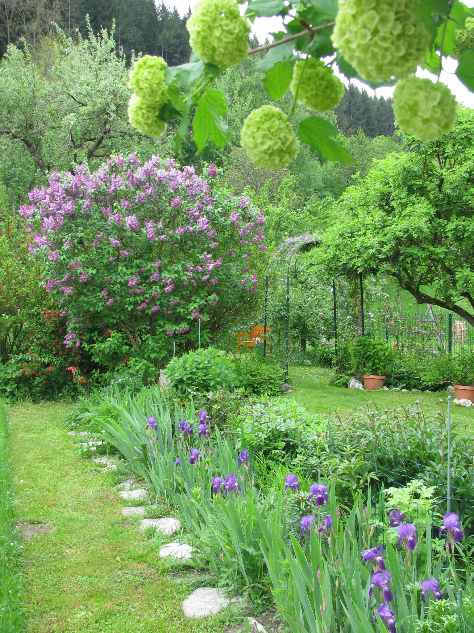 În simfonia de nuanțe de verde a peisajului de primăvară, movul irișilor de pe aleea din pietre și al liliacului spre care conduce acesta îmbogățește cromatica grădinii și îi imprimă o notă de eleganță.