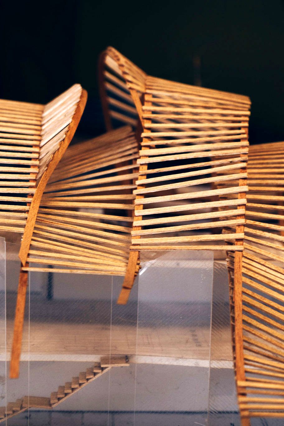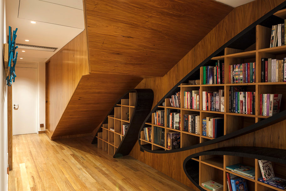Forma complexă a acoperișului – acoperit cu șindrilă de lemn – este dată de grinzile curbate din lemn glulam de eucalipt, susținute de stâlpi galvanizați cu secțiuni circulare tubulare. Geometria este complexă, fluidă, aproape biomorfă, intrând într-un limbaj arhitectural rar întâlnit în proiectele rezidențiale urbane.