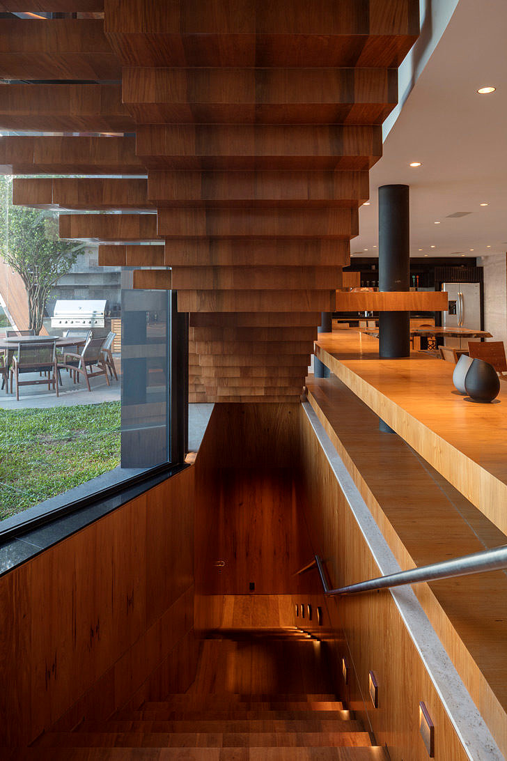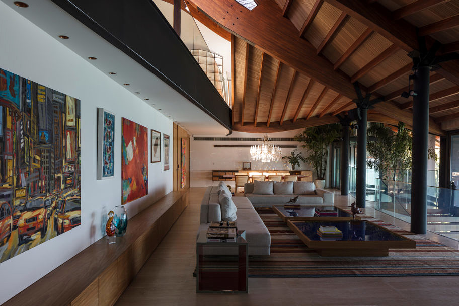 Din casă, nu vezi pământ, ci doar marea, insulele și cerul. Se aud doar vântul și păsările, dar și sunetul plăcut al bărcilor plutind. Este ca și cum casa ar fi o navă care caută linia orizontului. Și aceste valuri au fost inspirația pentru designul ondulat al acoperișului care protejează casa de soarele nefavorabil al orașului Rio, spun arhitecții de la studioul brazilian Mareines Aquitectura, cei care au proiectat locuința.
